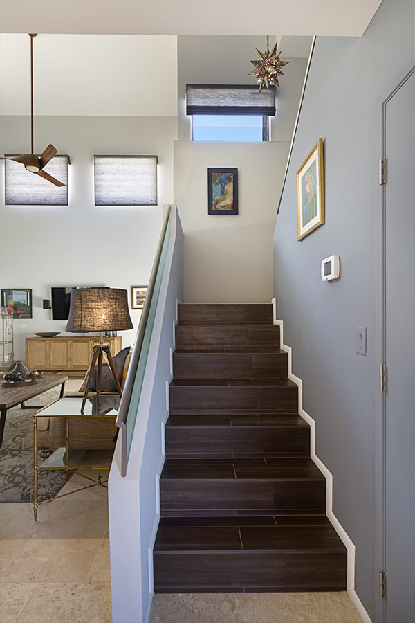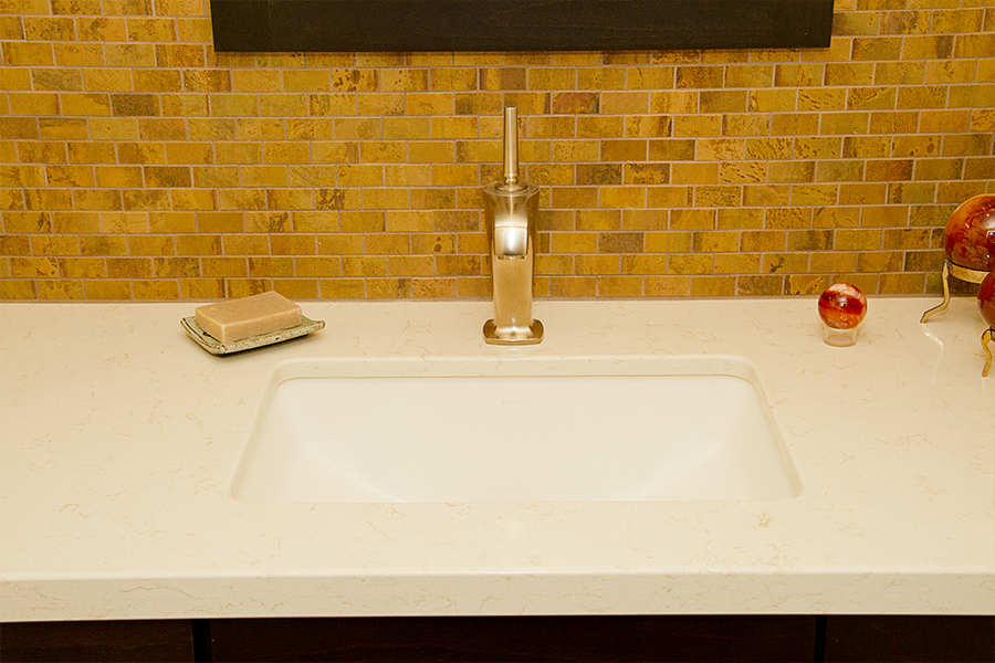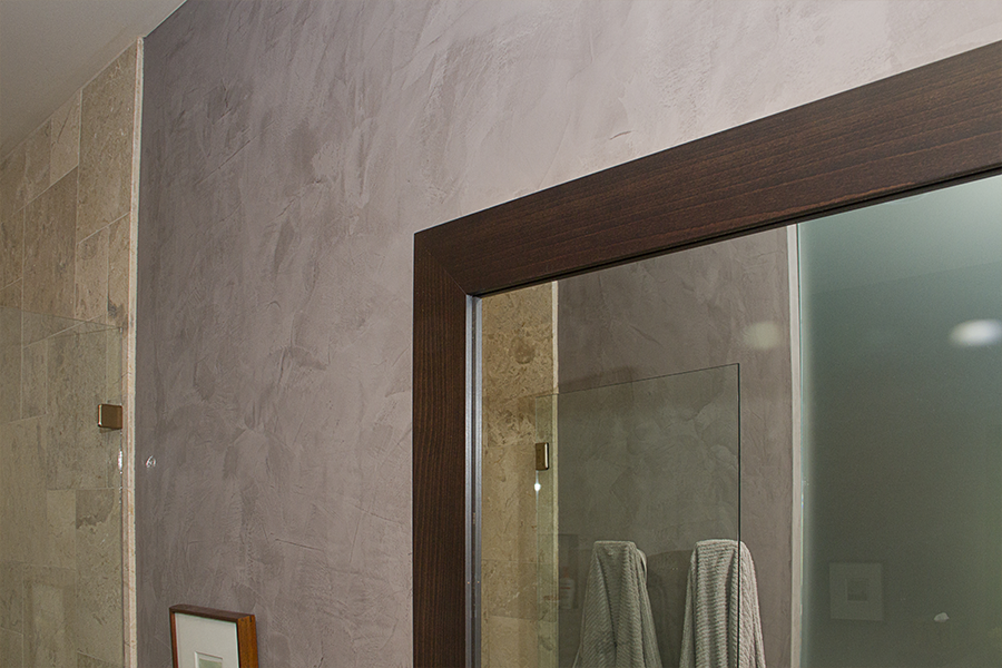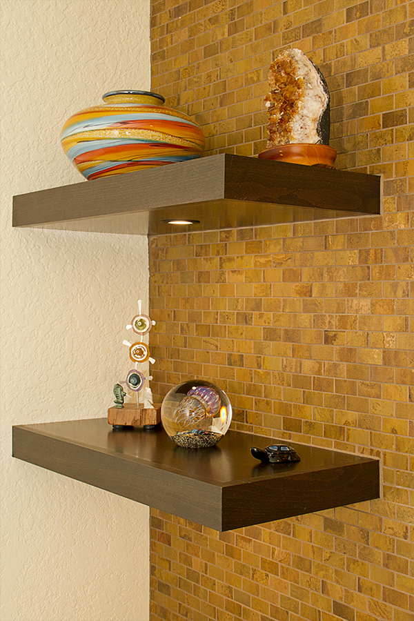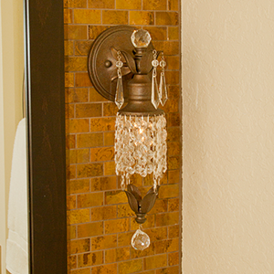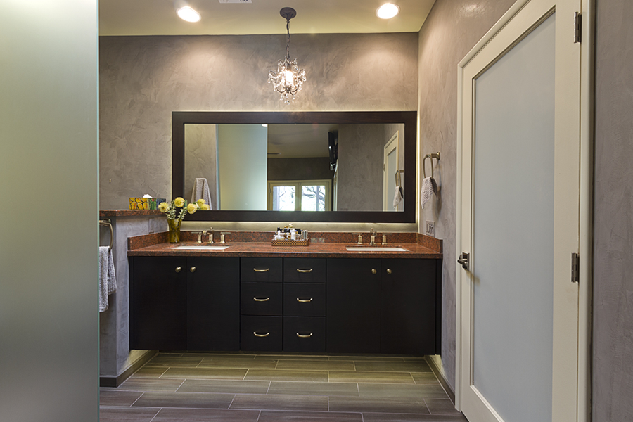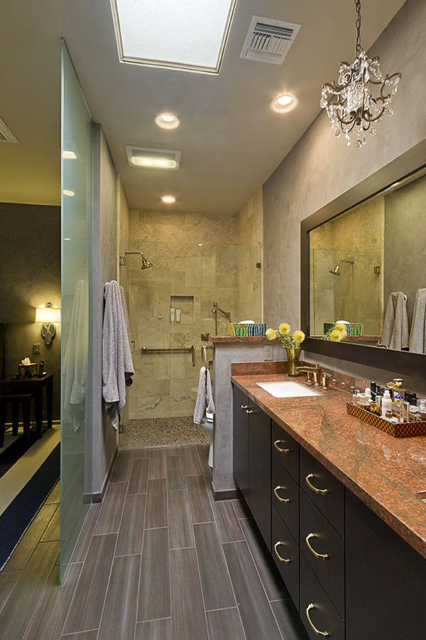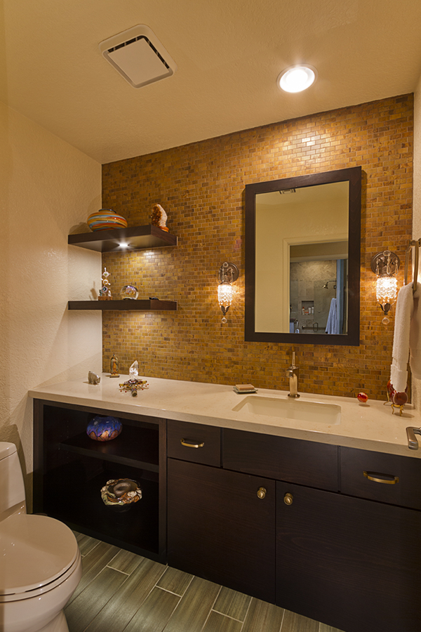 A porcelain look wood floor tile was installed and that’s when it looked like the proper stopping point should extend into the hall and then into the powder room. To repeat the frosted glass room divider, we decided that the all the doors could be painted framed doors with the same frosted glass. A yummy Venetian Plaster was selected to create silky smooth walls and rich Red Dragon granite looked exquisite on the master vanity and on the master shower bench. We added layers of light from recessed cans to the petite chandelier hanging over the vanity, to the back lit mirror and running lights under the cabinets. In the guest suite, the concept was to reuse elements in the master without making it exactly the same. The chocolate cabinetry acts as a nice anchor and the brushed brass accent was used to create a feature wall with similar romantic lighting layers.
