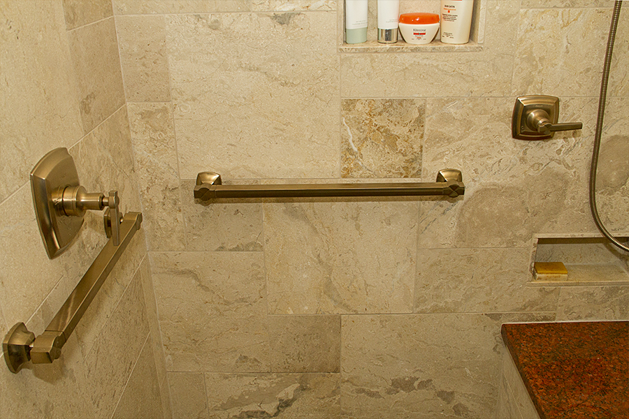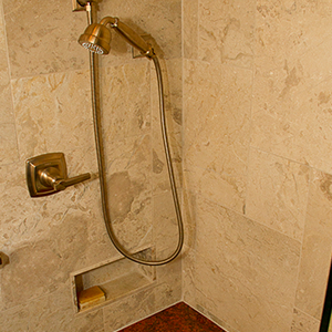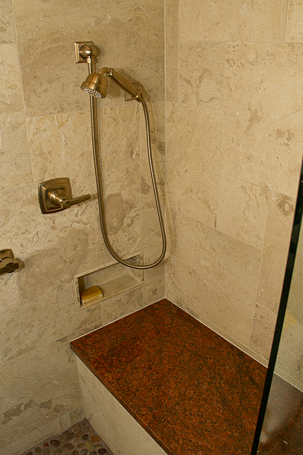 As one thing leads to another, the first idea of a master bath remodel snowballed into remodeling the master bedroom, then the hallway and then the guest bath. From our first meeting, the owner and I were on the same wave length for the master bath’s romantic feel. She wanted lower maintenance and better function if I could throw that in too. For the layout, removing the wall that caged the shower and toilet separately allowed us to move the toilet and create a reasonable sized walk-in shower with a long bench, a place to pamper yourself. Then something interesting happened. Right when you entered the master suite there was an angled wall with a door to the master bath less than a step into the room. It was disjointed, so we removed the angled walls and conflicting doorways and found that a straight narrow frosted glass panel could be used as a divider wall between the space and the illusion was that both rooms become larger.