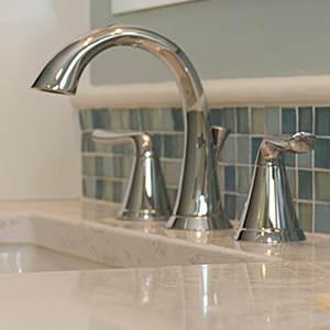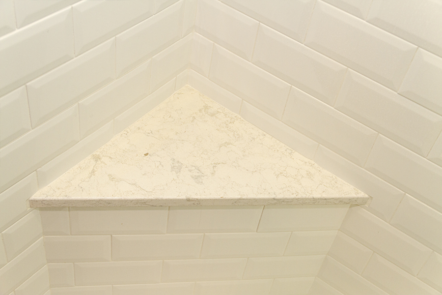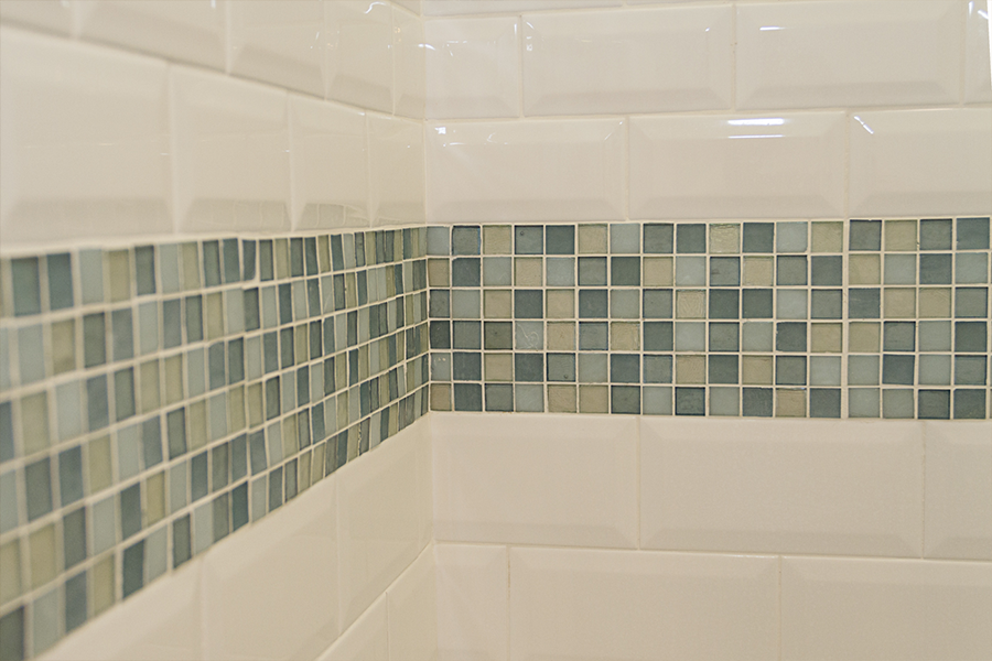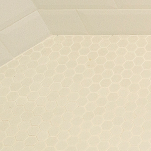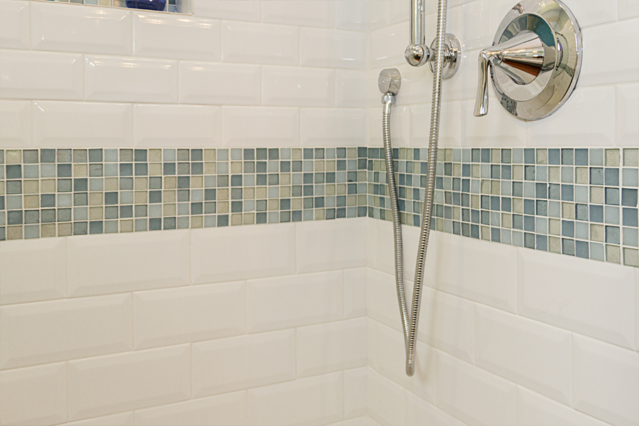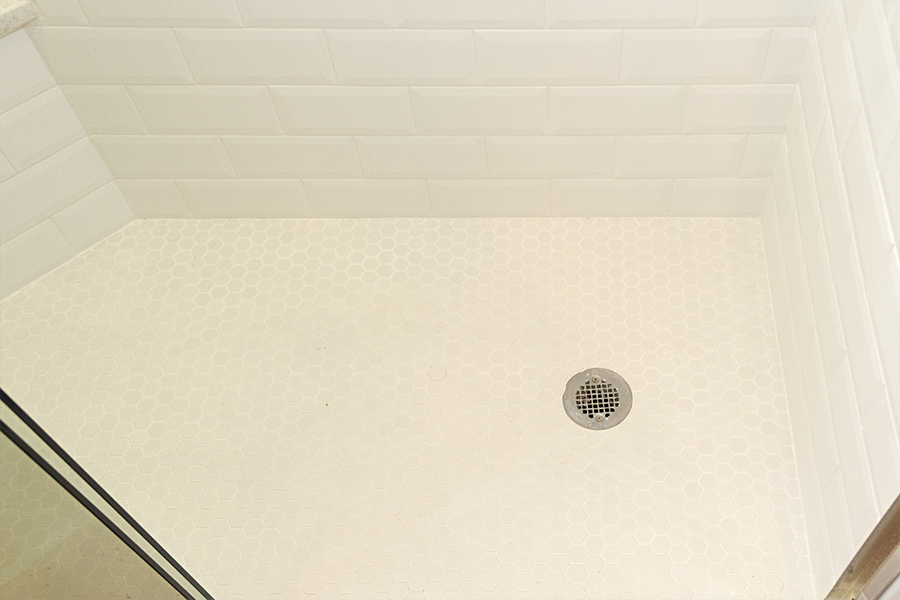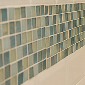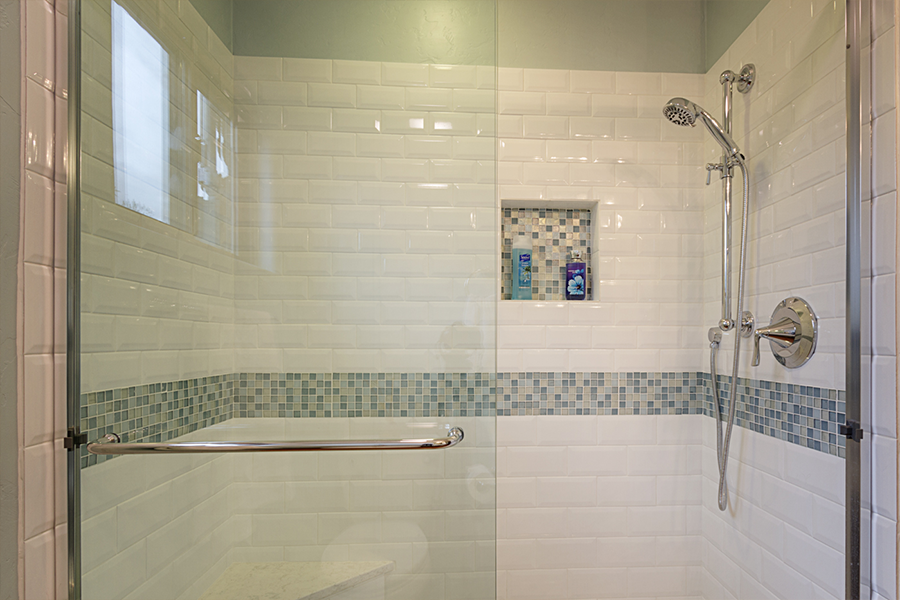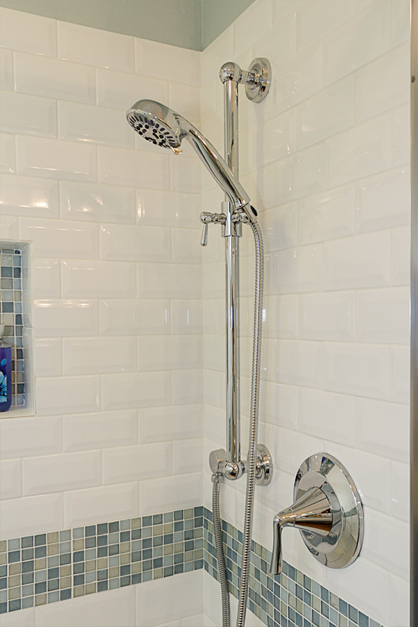 The bathroom is very narrow, so creating a walk-in shower that was easy to access was a must. Bypass glass sliding doors offer a wide opening and no interference from door swing. A corner bench offers a place to rest and assist with shaving. The shower system is adjustable in height for guests and also features a handheld that will reach the bench and make maintenance easier. A simple color scheme of white and blue helps lift the room off the earthy Saltillo floors. A combination of matte and polished finishes achieved a calming affect paired with delicate pastels that complement the soft curves of the fixtures.