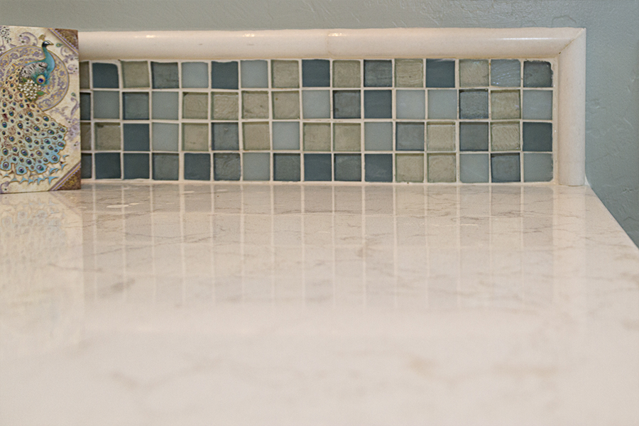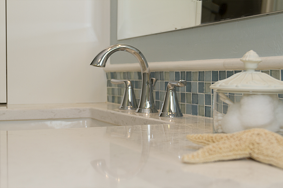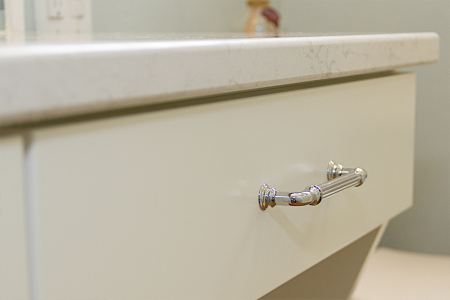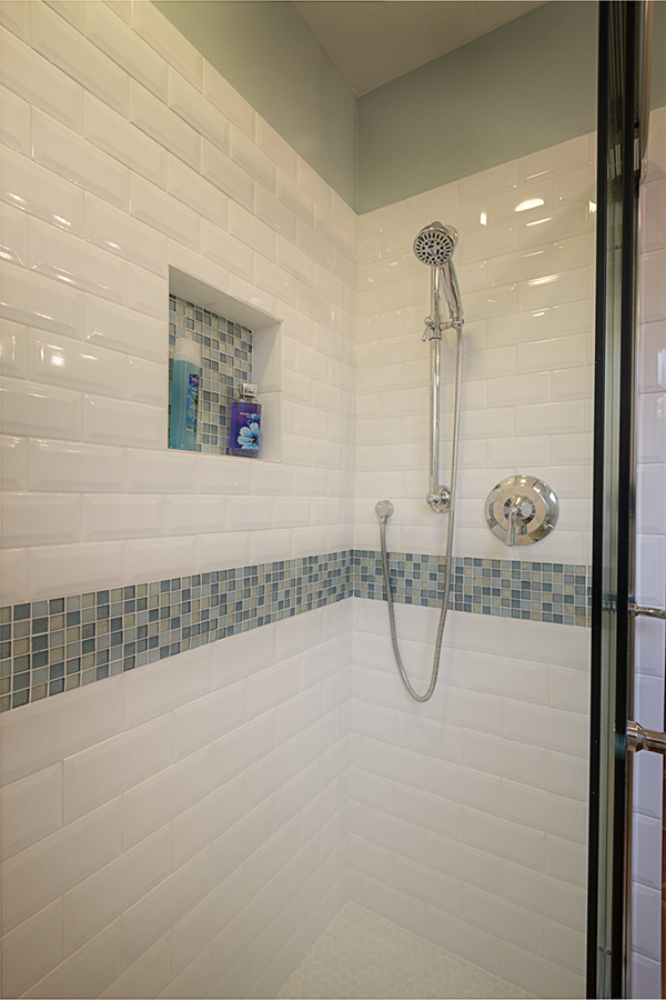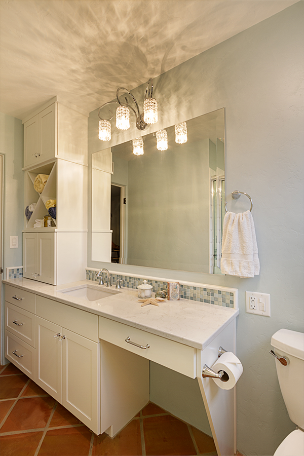After remodeling their kitchen and seeing how a designer can create storage and organization while achieving a desired aesthetic, the owner asked us to tackle her bathroom. On her dream list was better organization, a walk-in shower, a make-up vanity and to create a beach like feminine feel. The owner found the storage tower right when you walked in the door cumbersome to use. We divided what she was storing into categories and made separate cubbies for items that stay plugged in, for "fancy" items to be displayed and for "stocked" items to be stored. The sink and stack of drawers offered up additional storage for what was remaining thus freeing up space for a makeup drawer and an area to sit down and get ready.