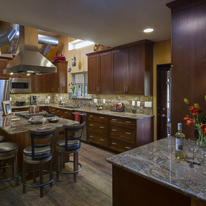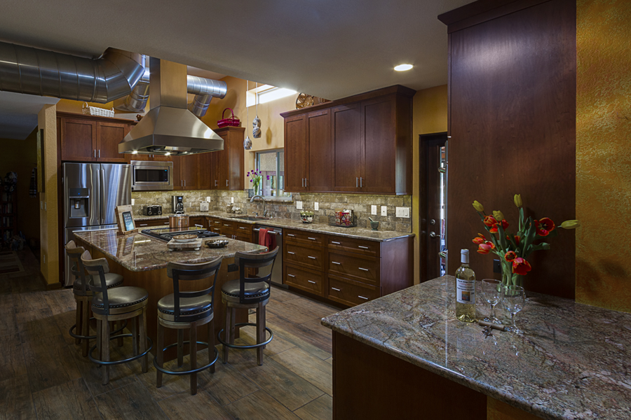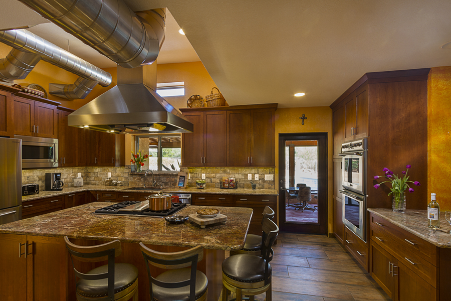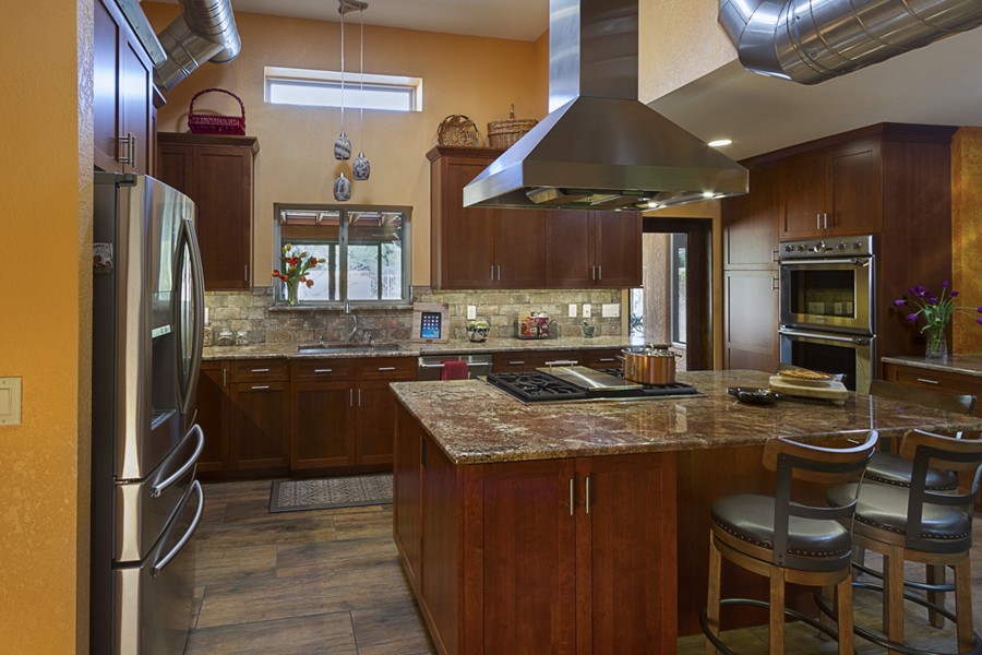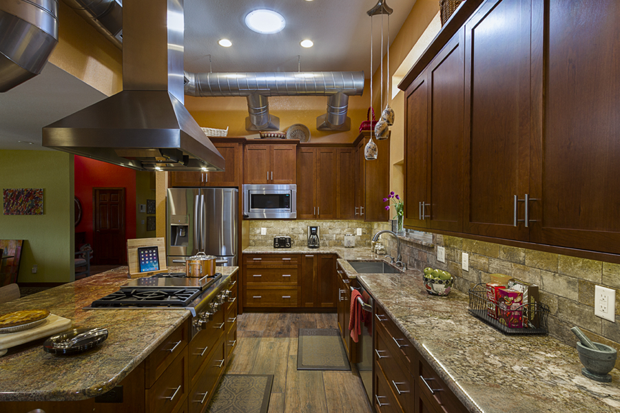 We took inspiration from a cabinet manufacturer’s catalog for storage in the guest bath while adding a simple linen cabinet in the master along with more drawers was enough to do the trick for storage. Flooring was predetermined from a shower redo before I came into the picture and it guided the selections for cabinets and counters. The kitchen is another story. I suggested taking down one wall will minimal ramifications and next thing we were looking at knocking down loadbearing walls and removing soffits carrying important mechanical components. Fun! We carried the cabinet used in the bathrooms but elected for a more traditional floor and rustic backsplash to nod back to the Spanish style of the home. The owner’s hearts were bursting with color, so they took some chances with bold colors and industrial ductwork to put their mark on the final outcome.