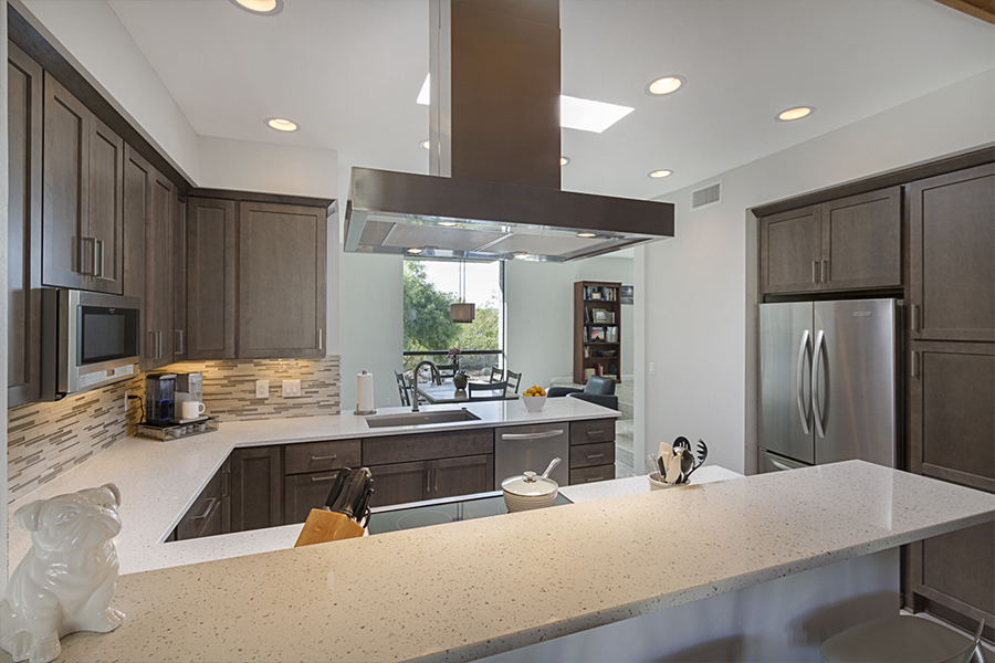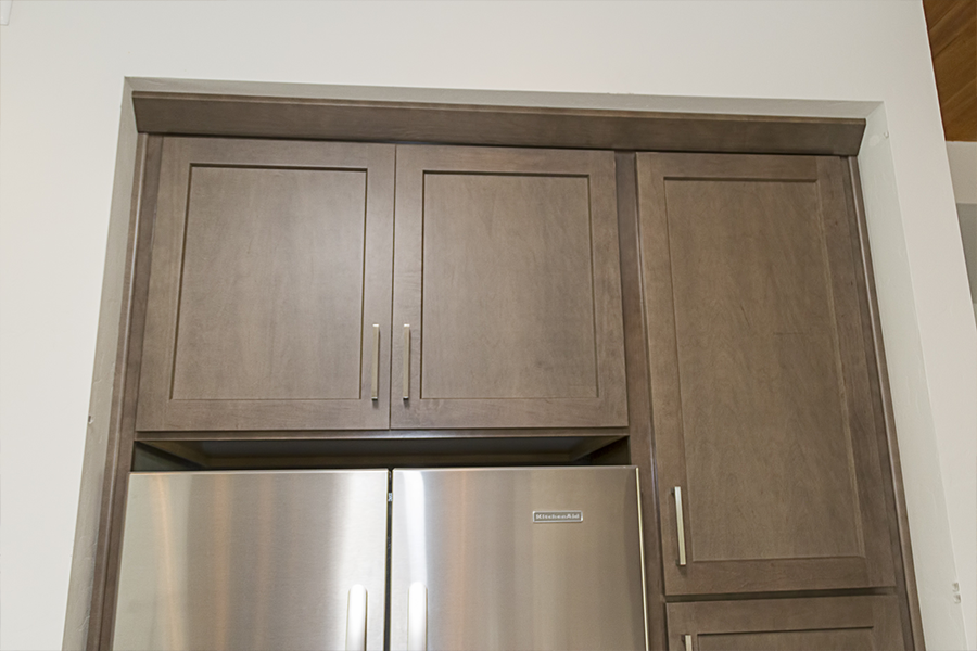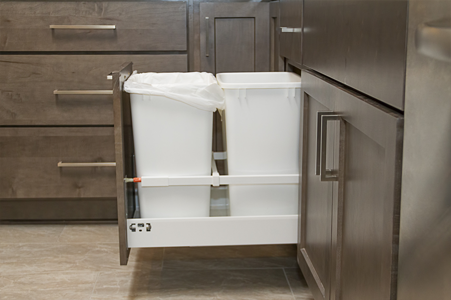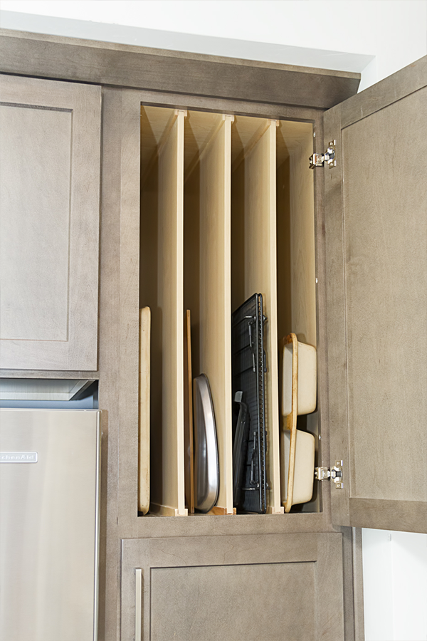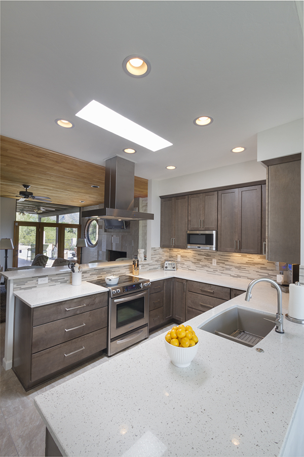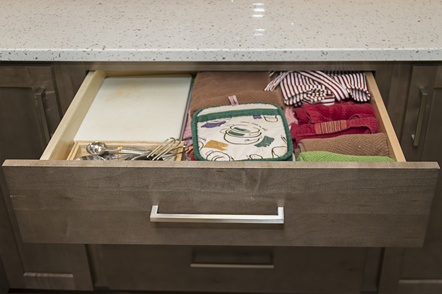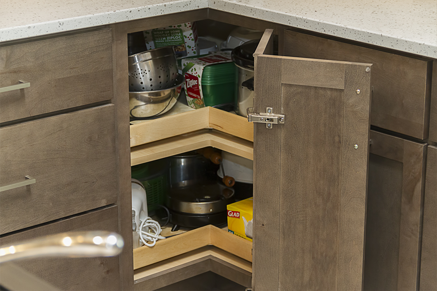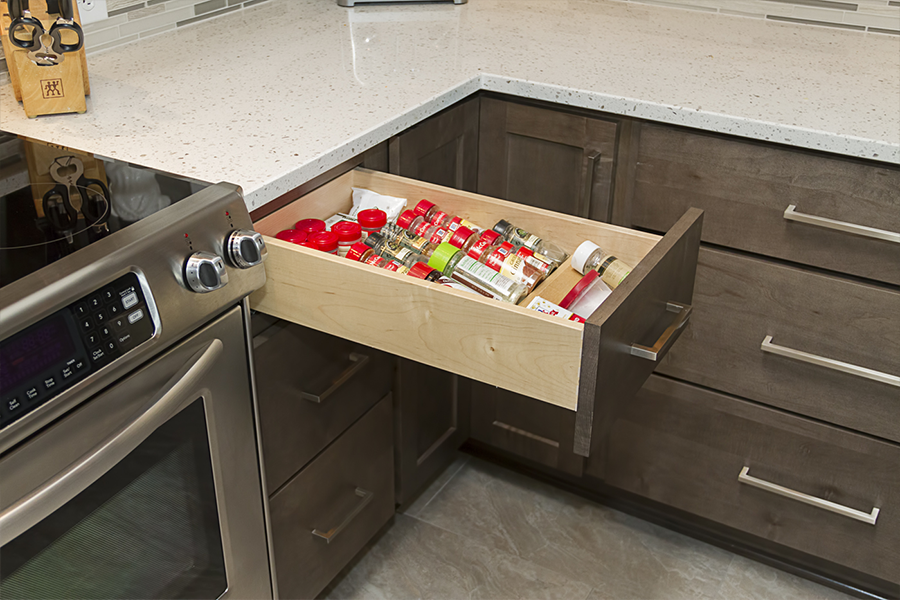 She loves to bake and where the shared wall with the dining room was opened up a deeper counter was created and made rolling out her famous cinnamon rolls much easier to work from three sides. Several long work spaces were created with the new layout that will allow the whole family to contribute to cooking and cleaning. Having moved so frequently, efficiency was the owners middle name and she specified the purpose of every cabinet and storage solutions were inserted to make daily operation optimum. The list includes: two super lazy susans, a double waste basket pullout, silverware organizer, and a spice organizer.