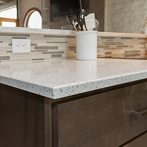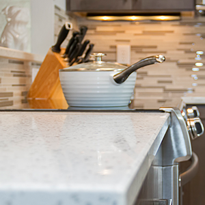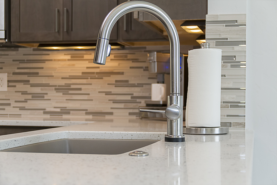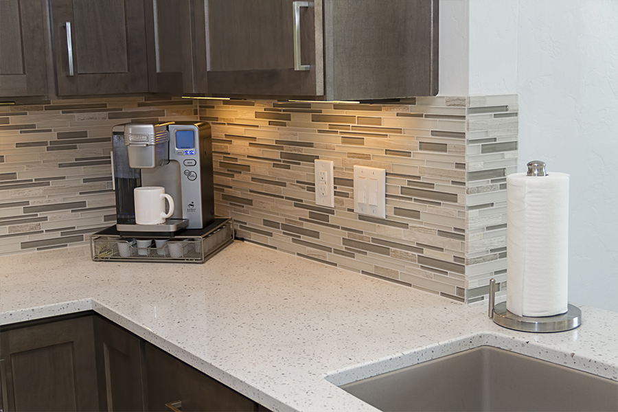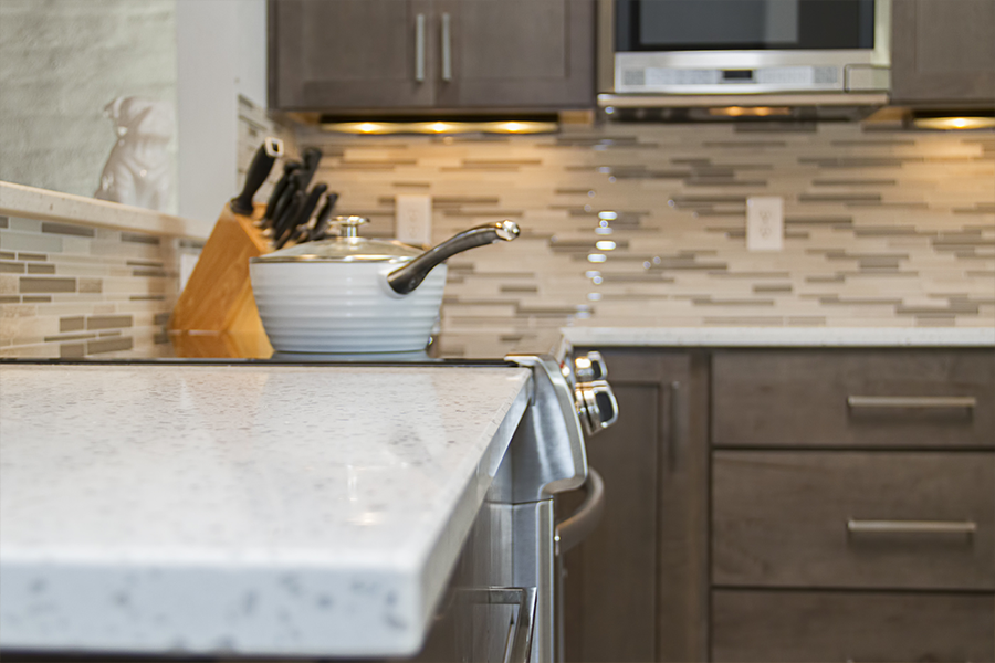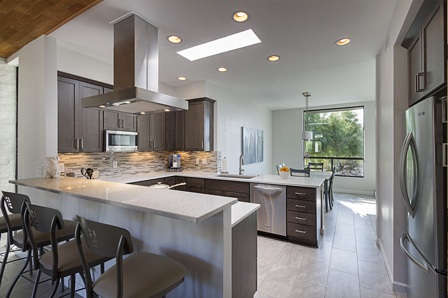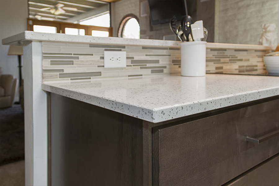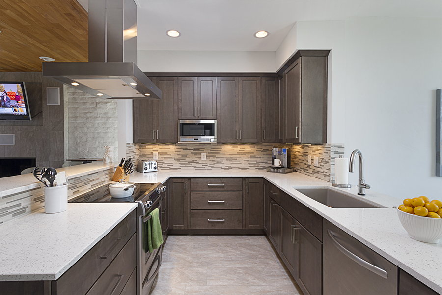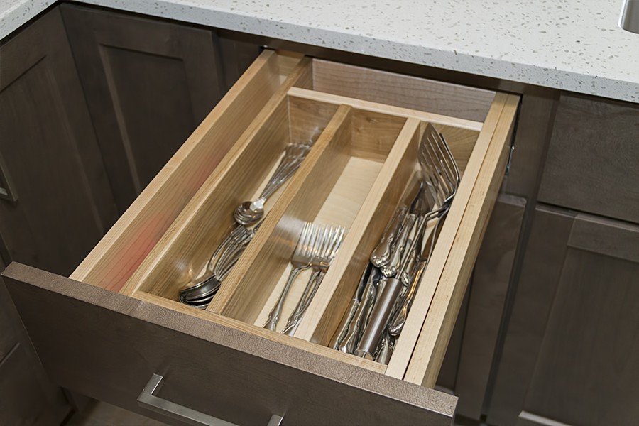 She loves to bake and where the shared wall with the dining room was opened up a deeper counter was created and made rolling out her famous cinnamon rolls much easier to work from three sides. Several long work spaces were created with the new layout that will allow the whole family to contribute to cooking and cleaning. Having moved so frequently, efficiency was the owners middle name and she specified the purpose of every cabinet and storage solutions were inserted to make daily operation optimum. The list includes: two super lazy susans, a double waste basket pullout, silverware organizer, and a spice organizer.