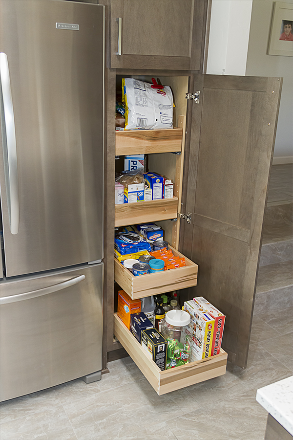 This military family finally got their first house to call their own. With so many kitchens lived in they knew what they wanted but weren’t sure how to create it. After no less than 15 design options taking over adjoining spaces, the winning design was so simple it didn’t use any more space than the current kitchen did. The decision to fill in a window is never easy, but the redesign knocked down an adjacent wall that was going to bring in light from a much larger window with a better view. Instead of an island, the owner selected an option to do a peninsula thus creating a u-shape kitchen. This allowed for more seating at the bar for the family to gather around. Then an underutilized walk-in pantry transformed to accommodate the refrigerator and a more functional pantry with rollout shelves and vertical dividers.