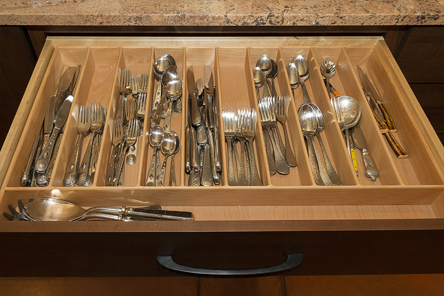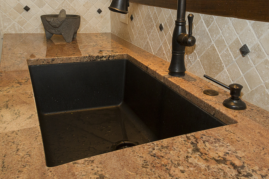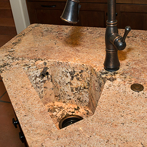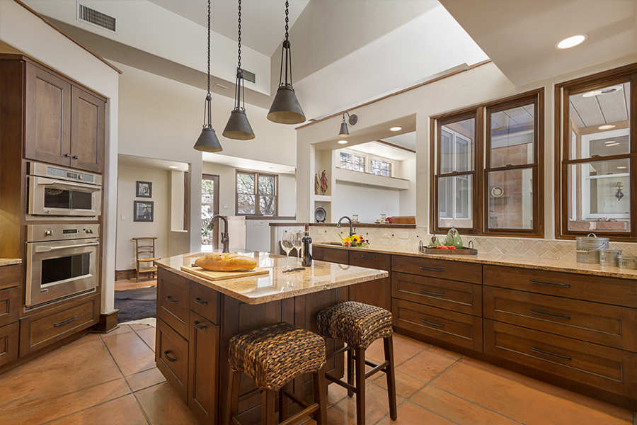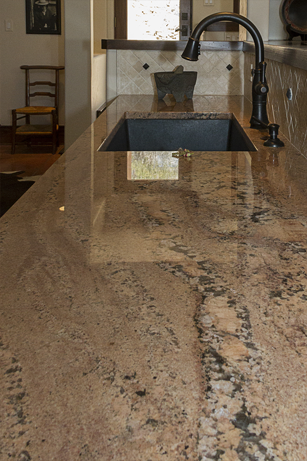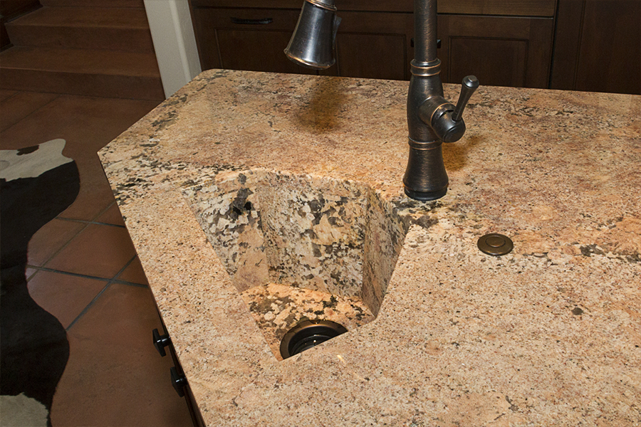 The location and some of the architectural features of this house were to die for, but some of the spaces were out of place and not in line with what one would expect when driving up and seeing this magnificent home. The kitchen was outdated with stock cabinets and the island was quite insignificant and there was a metal support post right smack in the middle of this sad space. Off to the side, there was a massive laundry room that looked like an afterthought of a space and lacked any function or storage. The kitchen space was improved by engineering the post into an exterior wall and removing a niche to lengthen the kitchen which allowed for a proper size island. My favorite granite fabricator worked to customize a sink to allow for maximum counter surface on the new island.