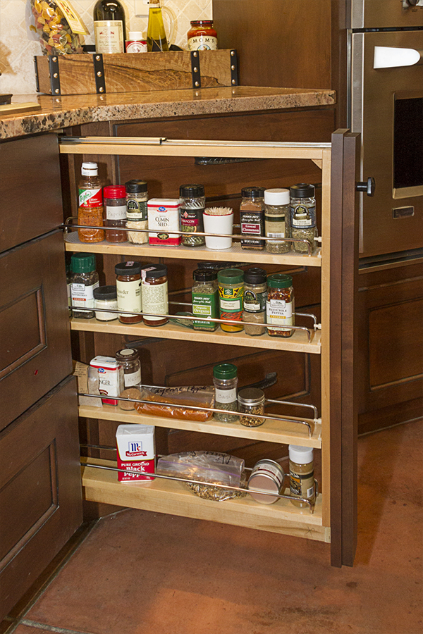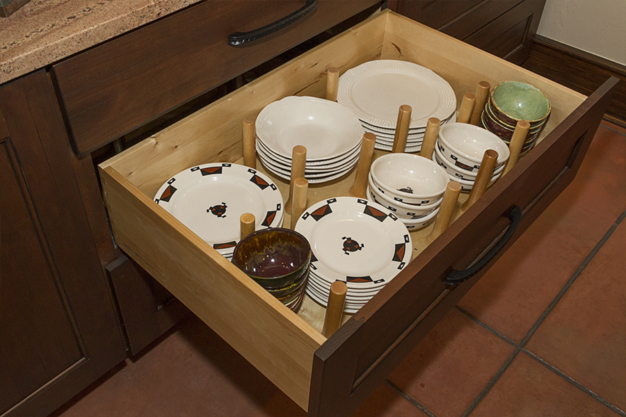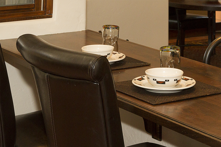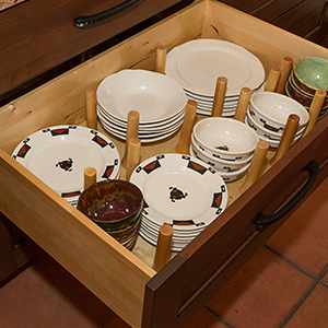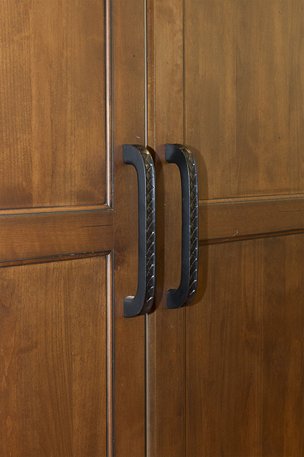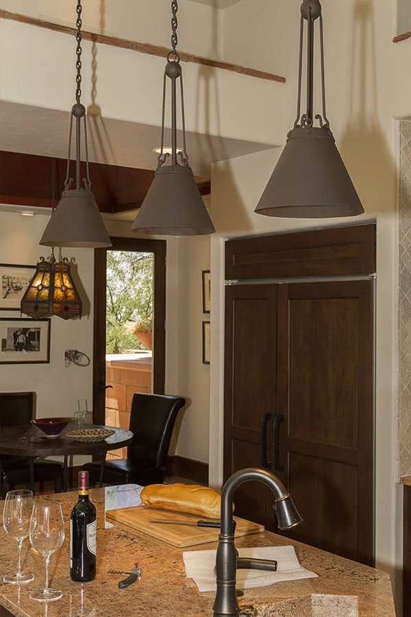 The 48” refrigerator and the 30” oven/microwave were left in the same space, but cabinets were customized to allow for as much space around the cooktop to do prep work and allow for a grandeur hood feature. The cabinet manufacturer custom finished the cabinetry to match all the window and door casings for congruity. Taking a page from the kitchen, the laundry room got a complete makeover. The same cabinetry with added storage features. A hanging rod/drying rack is conveniently located next to the washer and dryer while cabinets over the washer and dryer store all the laundry necessities. A bench seat with drawers for shoes and overhead hooks for coats and hats serves as part mud room for my Midwestern clients. Then there was still room to add a tall linen cabinet for storing all their gear for enjoying the mild winter weather and activities that brought them to Tucson.