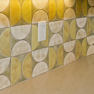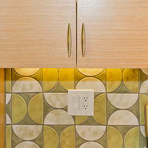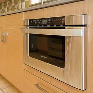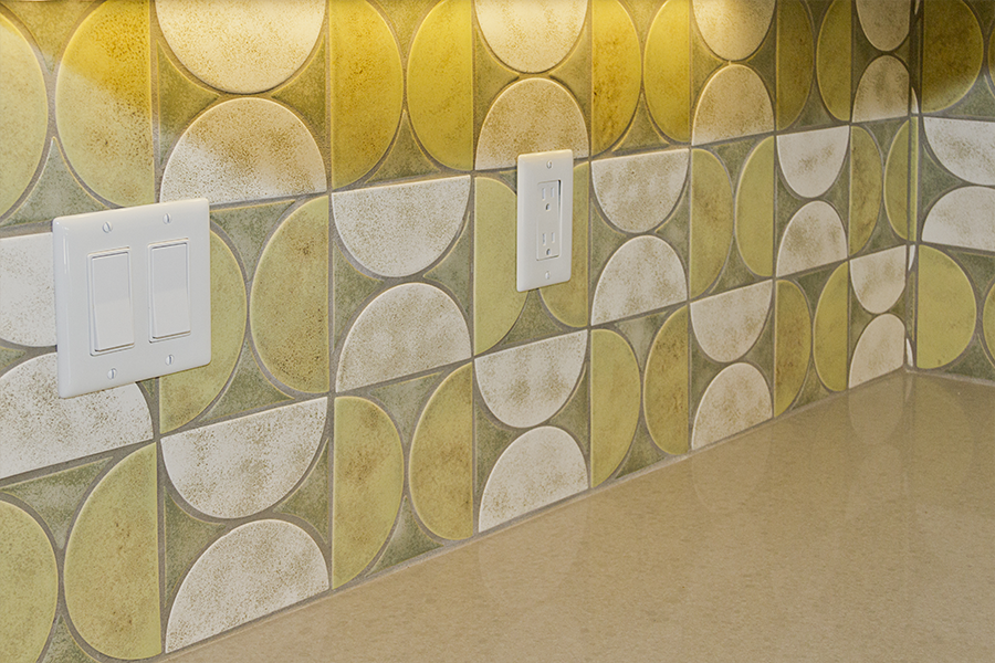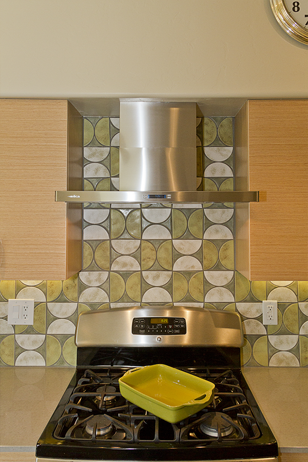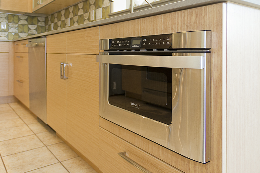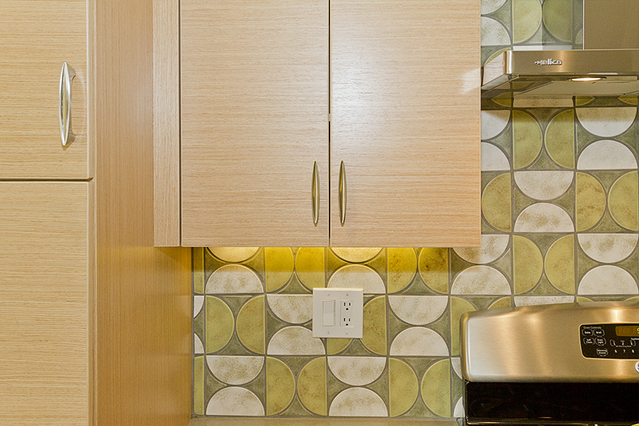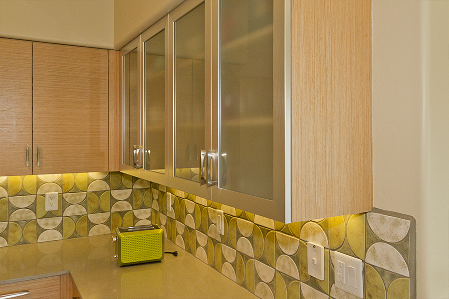 The owner appreciated the green approach of the reconstituted wood veneer door and chose a Quartz counter that provided the look of an industrial concrete but had the no maintenance advantage. After some reviewing of current trends, the homeowner elected to exceed some of the original budget allowances to get some features and looks of newer products. A canopy style hood took the place of the typical small kitchen microwave/hood which meant a new microwave space would need to be created. We had already designed a feature of aluminum framed doors with frosted glass above the counter so we began looking for a convenient place under counter which is sometimes a hard concept to switch to. The new generation of microwaves operate as a drawer and are automated for easy and safe access and fit well into the plan. The final piece of the puzzle sets the tone of an entire kitchen in my opinion, that’s the backsplash. With our original plan, the idea was simple and plain for the budget and the contemporary look, but as we poured through neutral tiles a handmade multi colored tile caught the owner’s attention and it was decided. A new light fixture and some fun hardware completed the look.