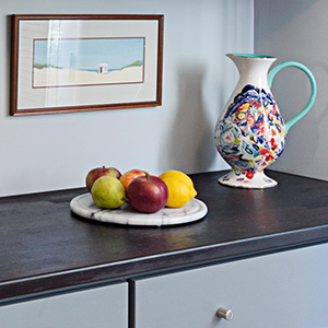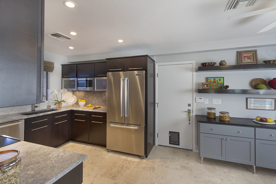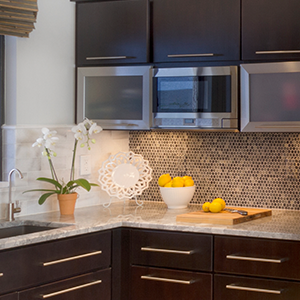 The client wanted to have a kitchen that felt as special with all the bells and whistles as her two recently remodeled bathrooms. Topping the list of priorities was: cutting edge appliances, finishes that would complement the other remodeled spaces, and extreme organization. Her goal was to declutter her life and home. The client was extremely excited about the appliance selection. A dishwasher that cleaned the dishes without prewashing was a dream come true. The hood was so quite she thought it didn’t work and she loved the colored illumination. The slide-in range featured all digital controls with a super sleek look. Finally, the microwave integrated seamlessly into the upper cabinets..