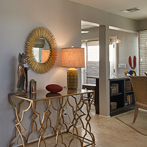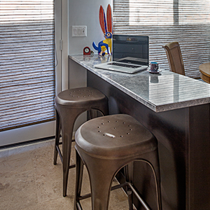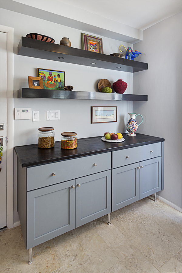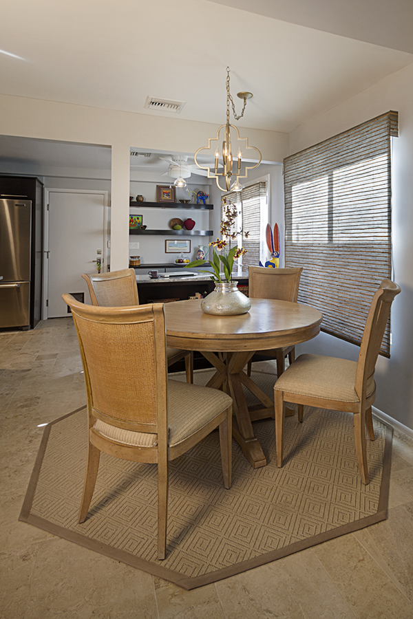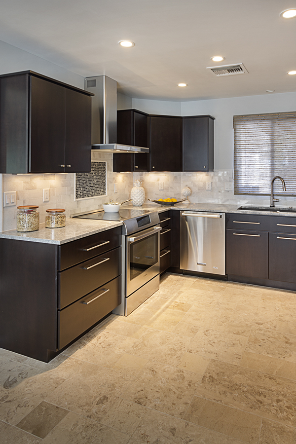 A brushed limestone tile in an intricate pattern, the same tile used on the shower walls was selected to continue for the main house floor. The counters, walls and backsplash were all a light shade of grey and a deep espresso cabinet added the right contrast to give a sophisticated look. Within the U-shape of the kitchen accessories clearly defined what would be stored where. Deep drawers house pots and pans, spices and oils have a rack conveniently located next to the hood, silverware and cooking utensils are strategically located where they will be most used. Transforming the nook into additional storage turned out to be one of the best features allowing display for treasures found while traveling and creating a work station that looked over the soon to be remodeled great room.