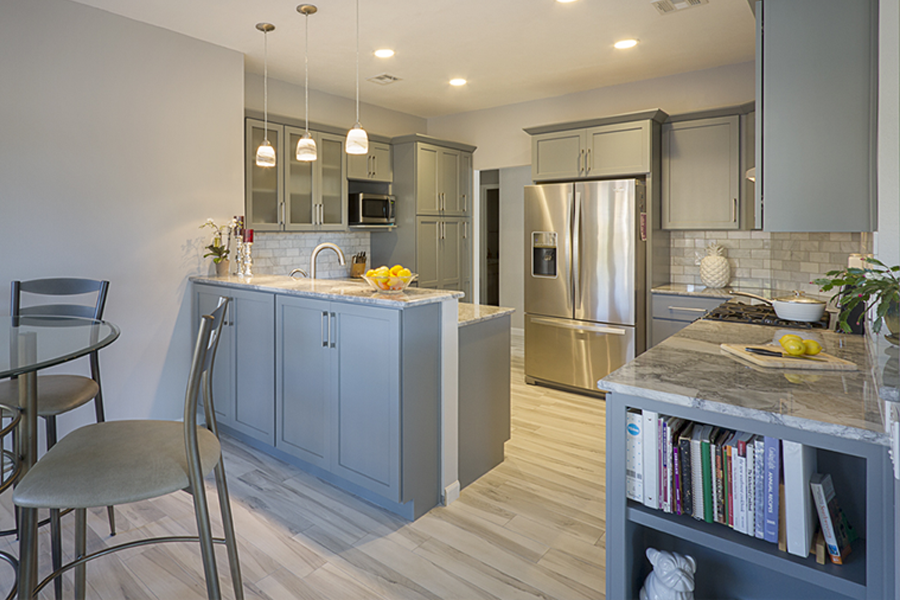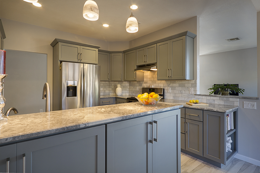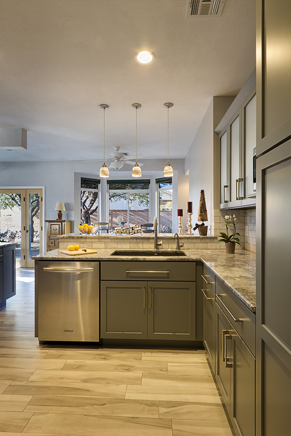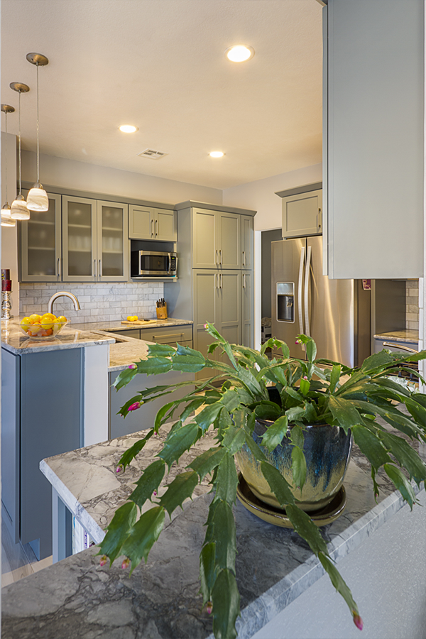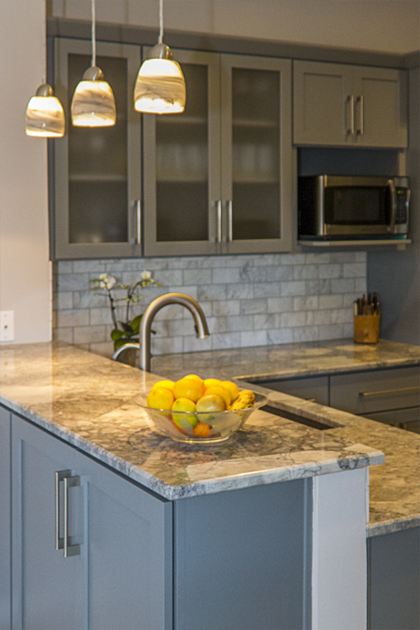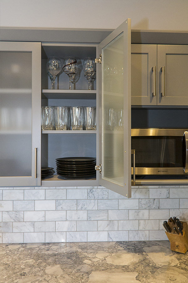 The trouble with grey is the finding the hidden color behind the scenes. You have to ask yourself “do I have a blue gray, a green gray, a brown grey…..” and then make sure all materials being selected are the right shade of grey. The homeowner wished to expand the kitchen and transform this subdivision home into her place of respite. Finding one material you love and building from it is greatly helpful in guiding decisions. When the owner and I first met she had floor tiles, granite samples, backsplash tiles and paint colors that she had collected and liked individually, but when she put them together they simply clashed and she felt like she was going in circles. I had her pick from these her favorite piece, which happened to be a beautiful dolomite counter called Super White and from there we picked all of the materials to highlight the grey that was in that sample.