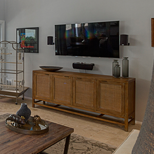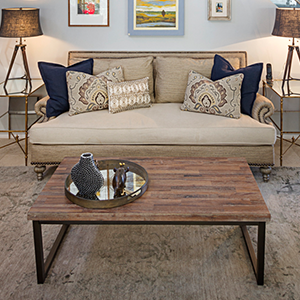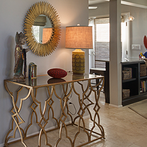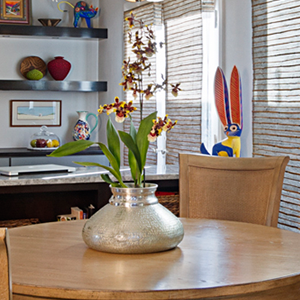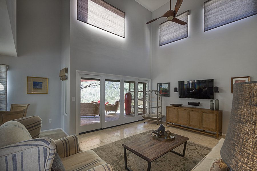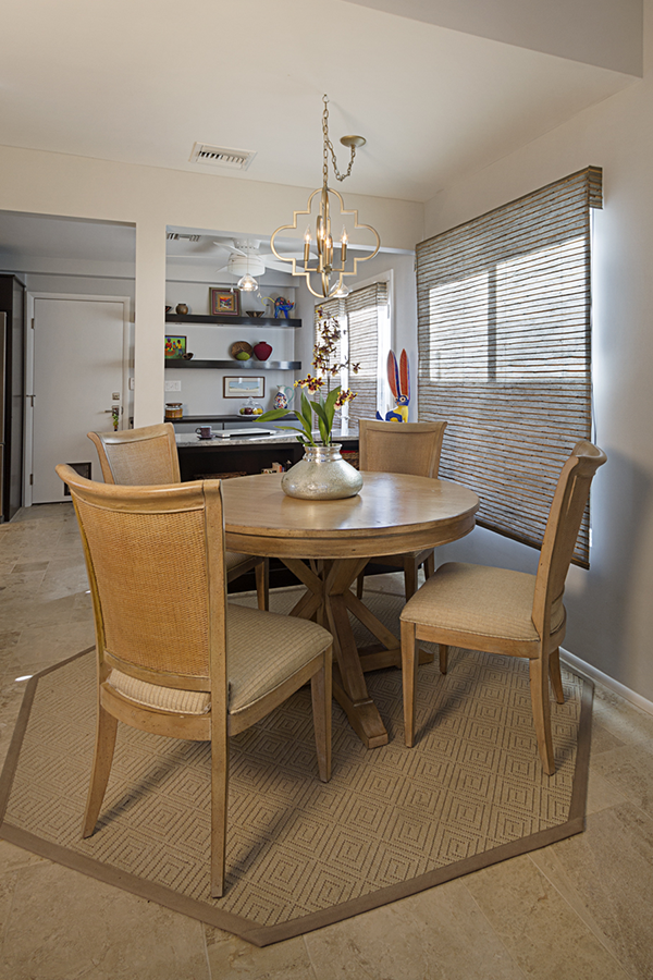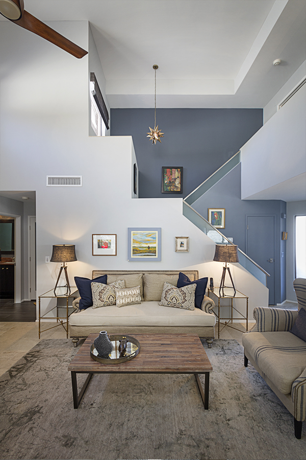 A therapeutic sifting through years of accumulated items and letting go of objects that no longer felt like they added joy left only artwork and a few sculptures which meant all new furniture and a whole new look. A brushed limestone tile in an intricate pattern was used for the floor downstairs and the stairway repeated the dark espresso finish of the kitchen in a porcelain plank. Solar powered woven shades allowed control of sky high windows while the addition of chandeliers, pendent fixtures, lamps and under cabinet lighting help create an inviting ambiance. Toning down the vibrant colors and being open to big changes in lifestyle helped us achieve a space that is peaceful and wonderful.