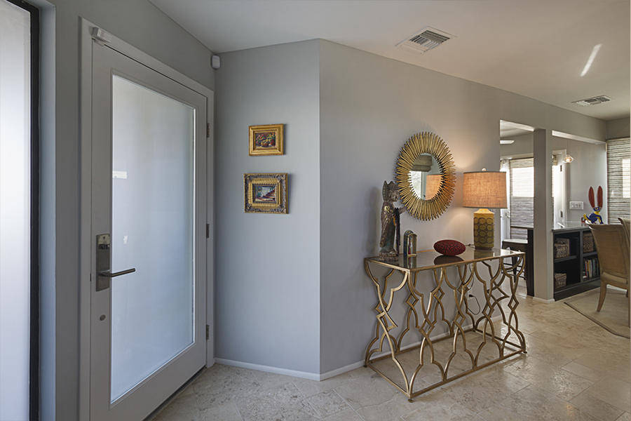 While the kitchen was being remodeled, the owner decided that having wonderful new spaces on both ends of the house with an incomplete middle was not good enough and thus started the great room remodel. A few structural changes increased the way the space would be used. A monochromatic palette and several lighting features were added. The structural change with the most impact to the space was removing the fireplace and small enclosed porch to create a wall of glass that opened up to a brand new patio that extended living space. The other change that was small but had a huge impact was taking out the heavy iron railing and wooden front door in exchange for frosted glass which is a light and joyful element.