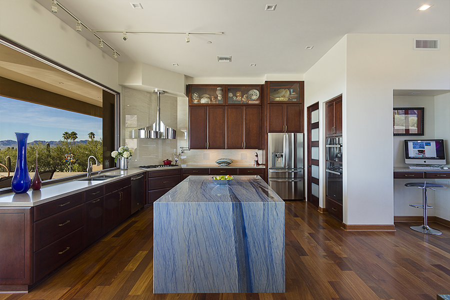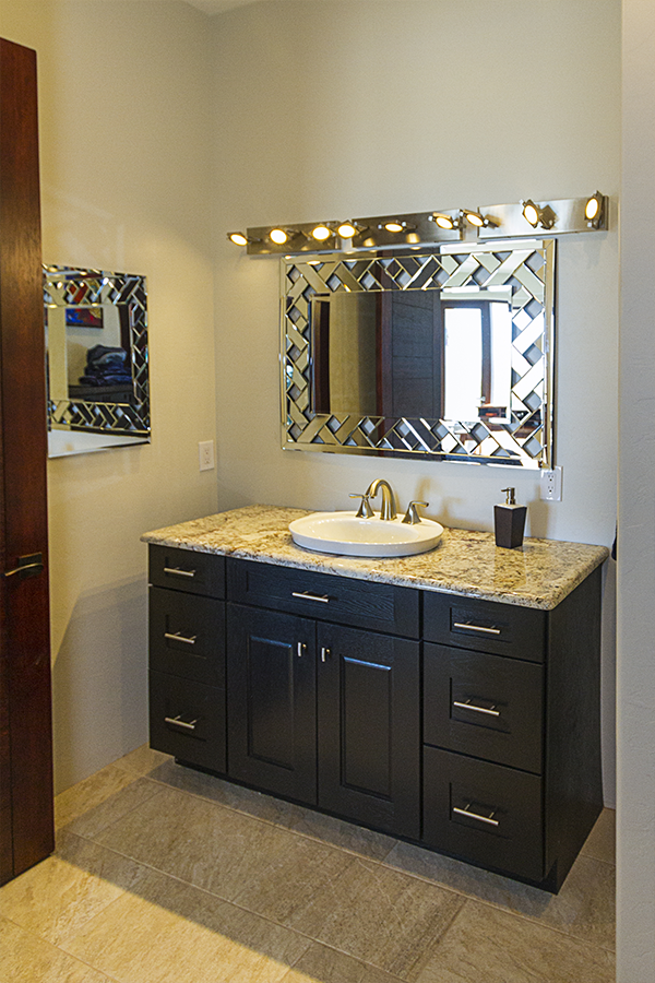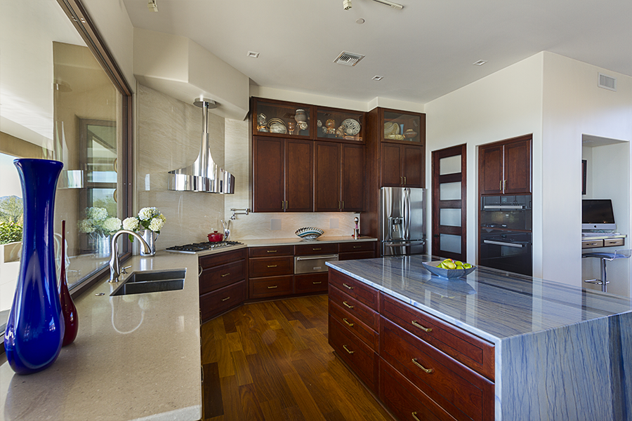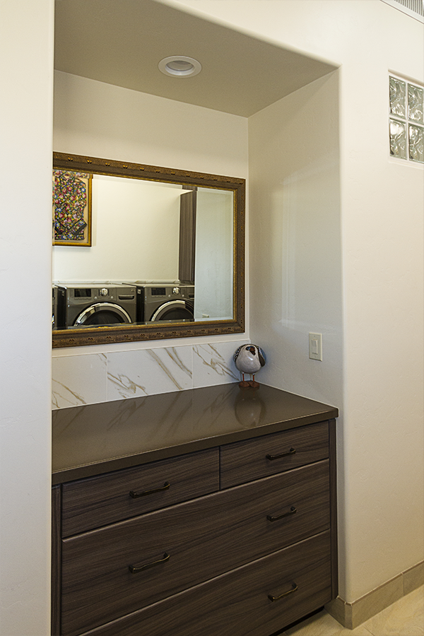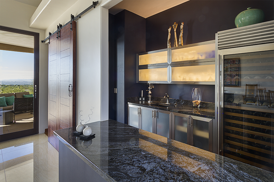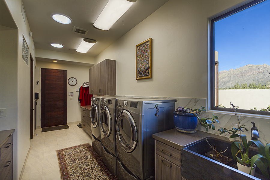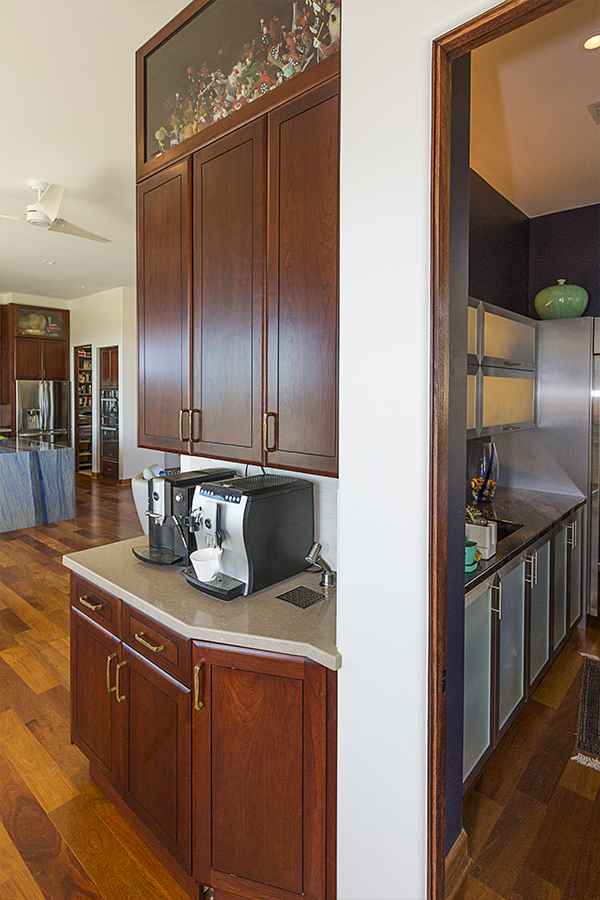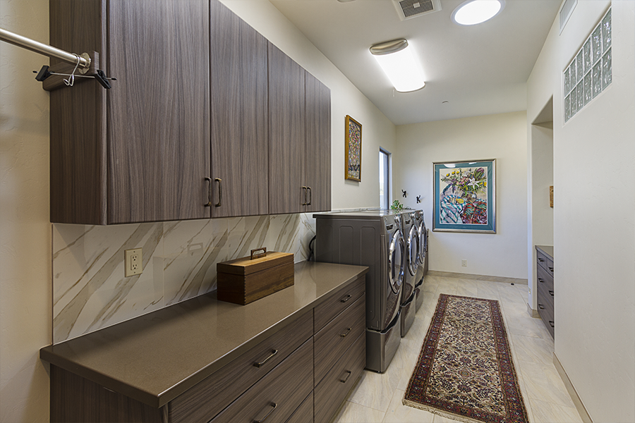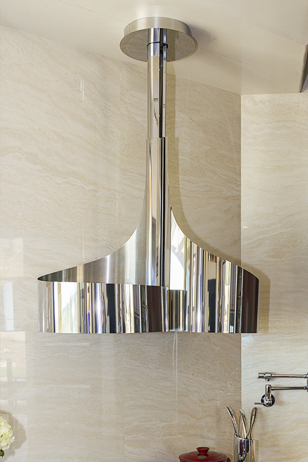 From the hood, that looks like a sculpture, to the single end waterfall island and the sky high-lighted display cabinets, every inch of storage in the kitchen was calculated for storage and placement. For the routine based kitchen tasks of shakes or coffee etc., the large walk-in pantry handles keeping the mess hidden from guests so they can appreciate all the view has to offer. Throughout the rest of the house, from the laundry to the bathrooms and the office, careful thought was put into the convenience of accessibility and building an aesthetic to fit the purpose. From casting hardware to match her grip, to customizing light fixtures for the exterior to match the size of nearby windows and to help bring cohesiveness to all the variations of materials, this owner did exactly what she wanted.