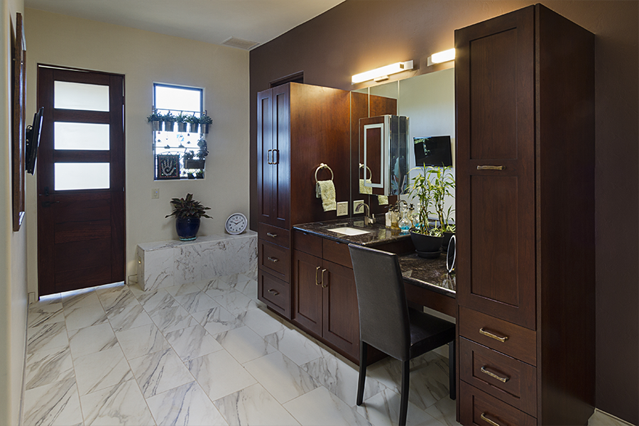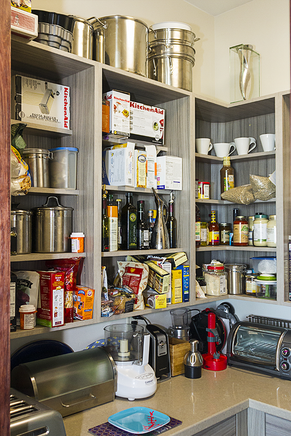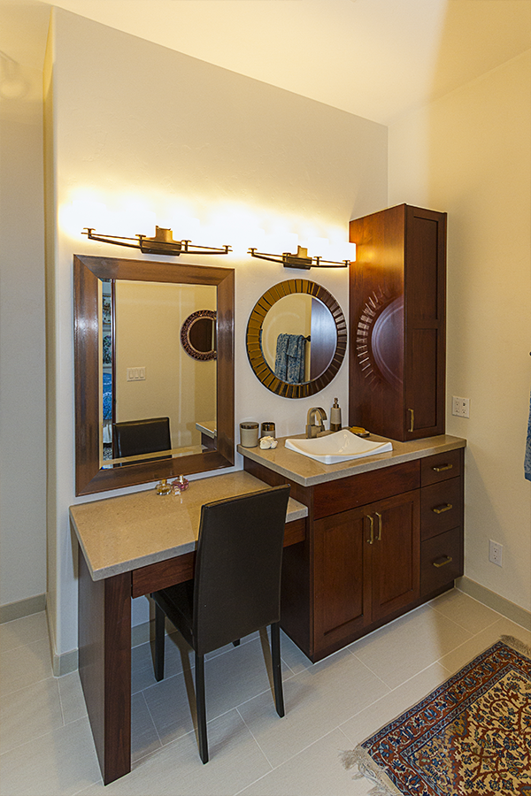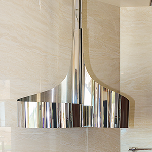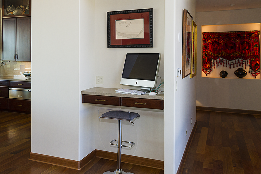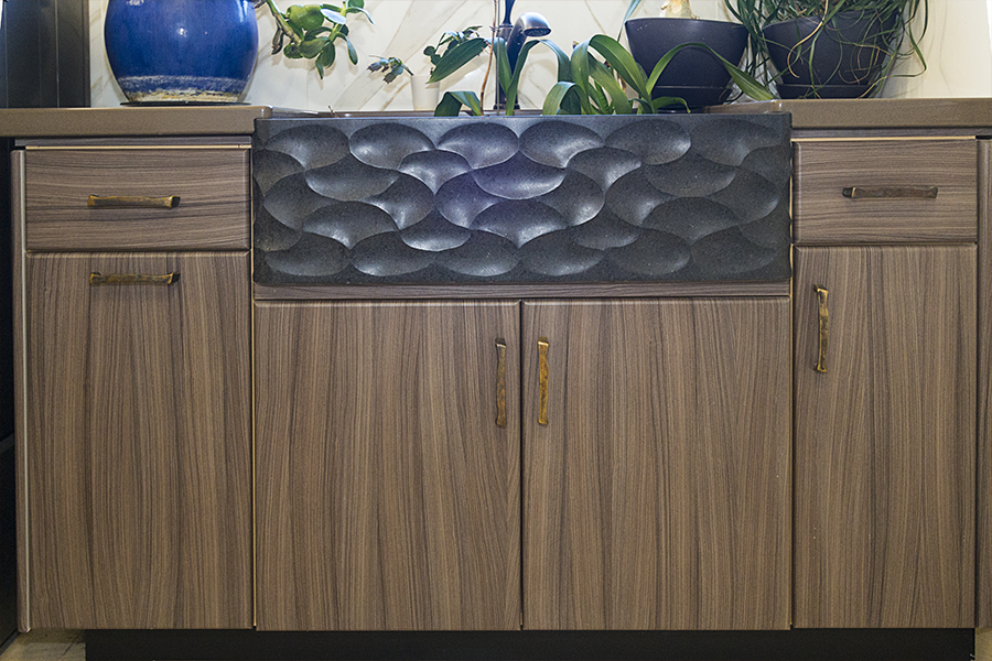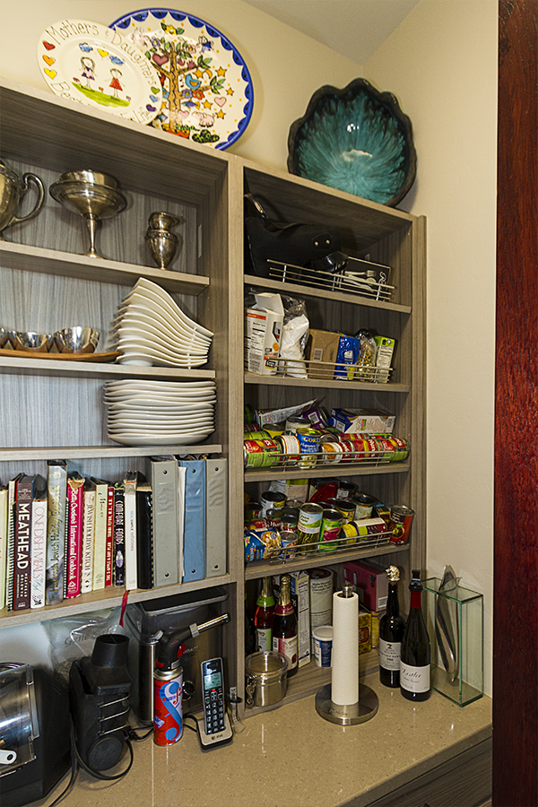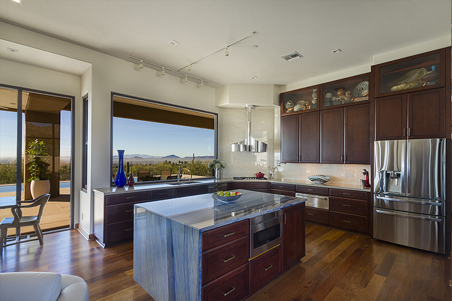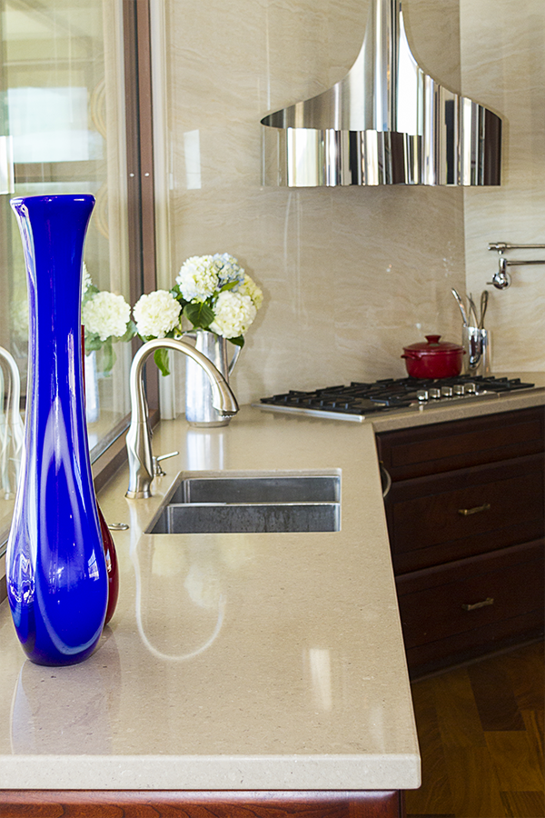 From the hood, that looks like a sculpture, to the single end waterfall island and the sky high-lighted display cabinets, every inch of storage in the kitchen was calculated for storage and placement. For the routine based kitchen tasks of shakes or coffee etc., the large walk-in pantry handles keeping the mess hidden from guests so they can appreciate all the view has to offer. Throughout the rest of the house, from the laundry to the bathrooms and the office, careful thought was put into the convenience of accessibility and building an aesthetic to fit the purpose. From casting hardware to match her grip, to customizing light fixtures for the exterior to match the size of nearby windows and to help bring cohesiveness to all the variations of materials, this owner did exactly what she wanted.