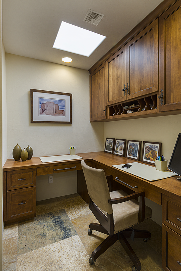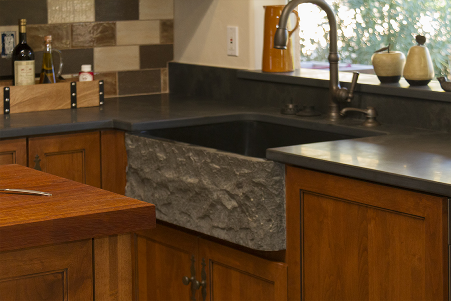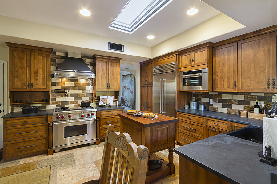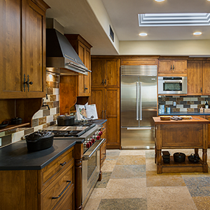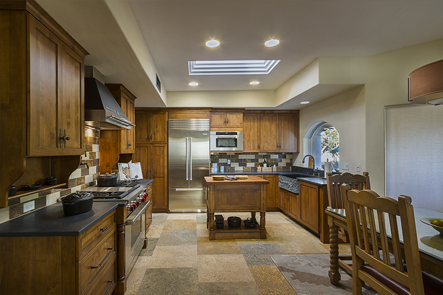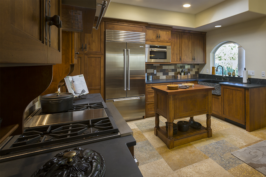 We removed the low ceilings and relocated the pantry and refrigerator to allow the cooking center to be a focal point. Changing the U-shape sink layout to an L-shape made space for a quaint island and gave better access to the eat-in nook. Moving the laundry area to the back of the house/near the bedrooms, opened the door to create a small office off the kitchen which is the hub of activity. Blended Rustic Travertine tile floors were a warm addition away from the cold rose/white ceramic floor tiles and helped pave the path towards the Rustic theme of the house. A distressed alder cabinet with unique chamfered edges was simple and interesting paired with black slate counters and handmade ceramic tile backsplash. A chiseled edge granite sink was the cherry on top of this remodel.