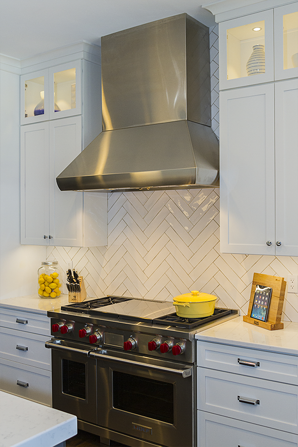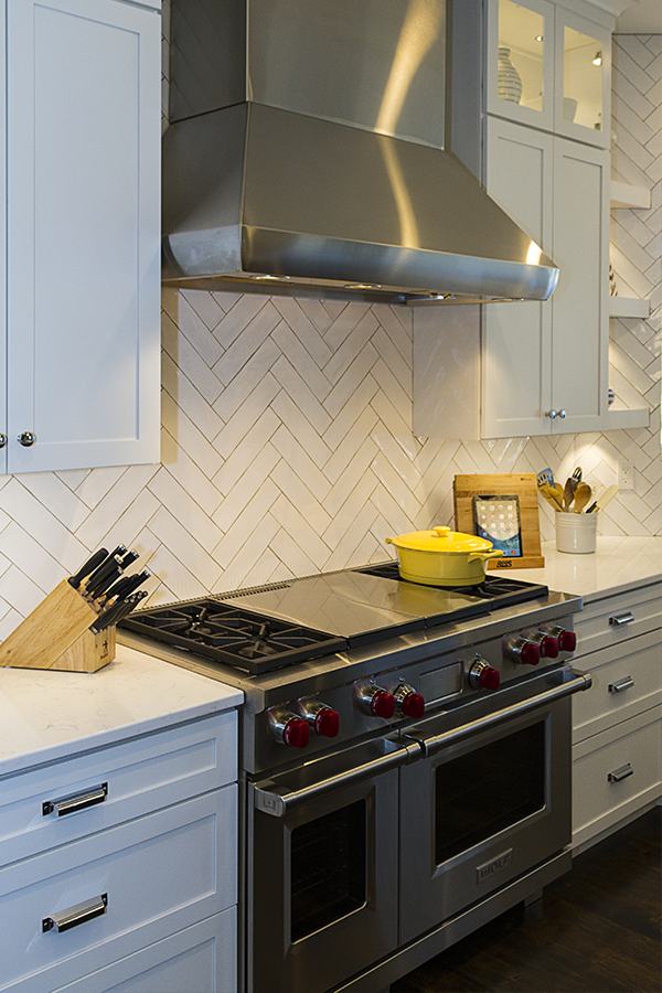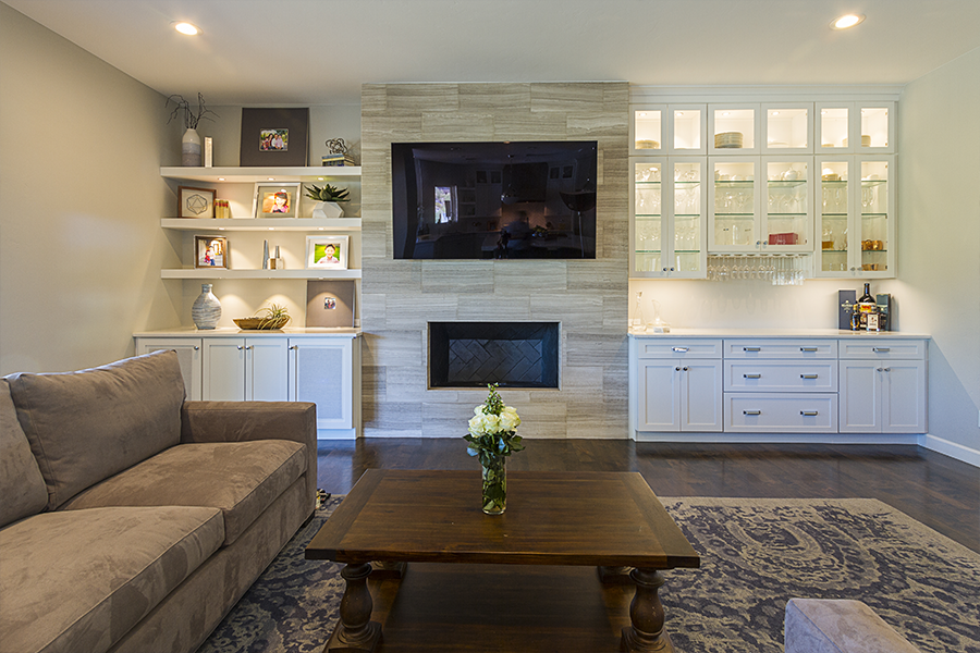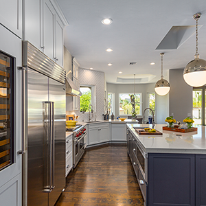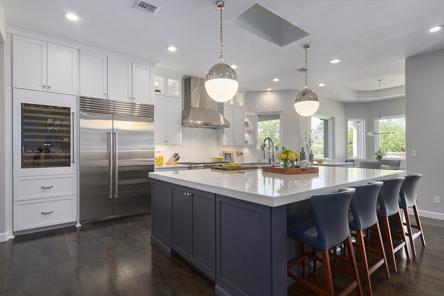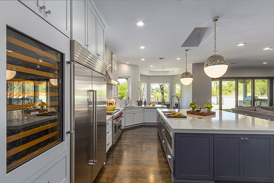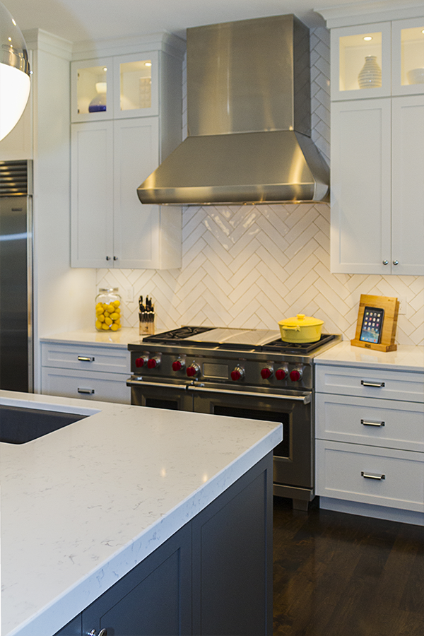 Ultimately, we supersized the island deciding there was plenty of room for furniture layout and the counter fabricator could make a nice seam. Careful consideration was taken planning the storage and placement of pieces including a sink and microwave drawer. Seating for four was incorporated on the far side. We also supersized the height of cabinets along the back wall with stacking cabinets and supersized the appliances with a 48” Wolf Range, 48” Sub Zero and 30” Wine Refrigerator. One thing leads to another, we added a dry bar and entertainment area across the room in matching cabinets. Then we added a laundry room in a fun light grey with encaustic tile floors. The kids bathroom matched the island with some fun tile patterns and finally we did dark moody office in shades of black on the walls, floors, cabinets counters and furniture.