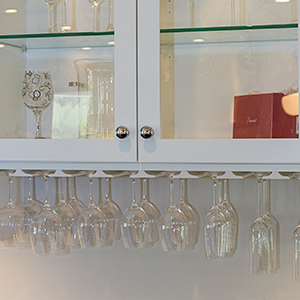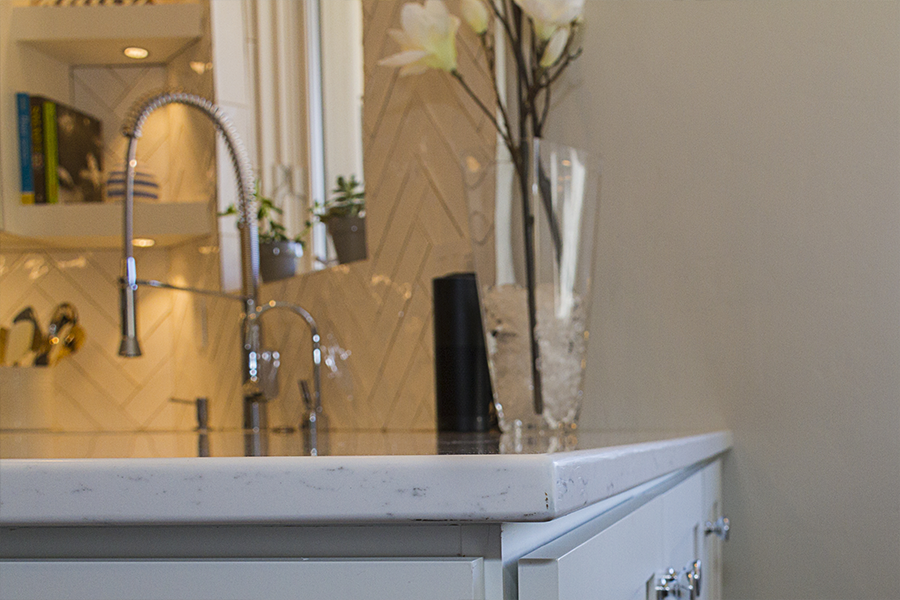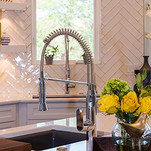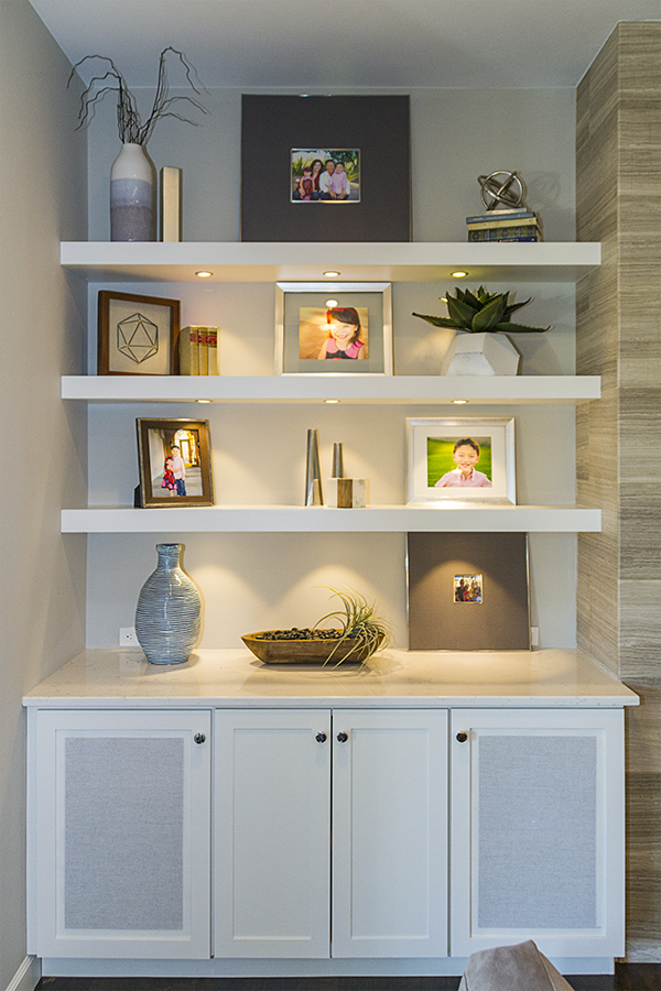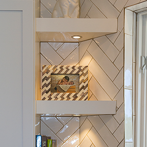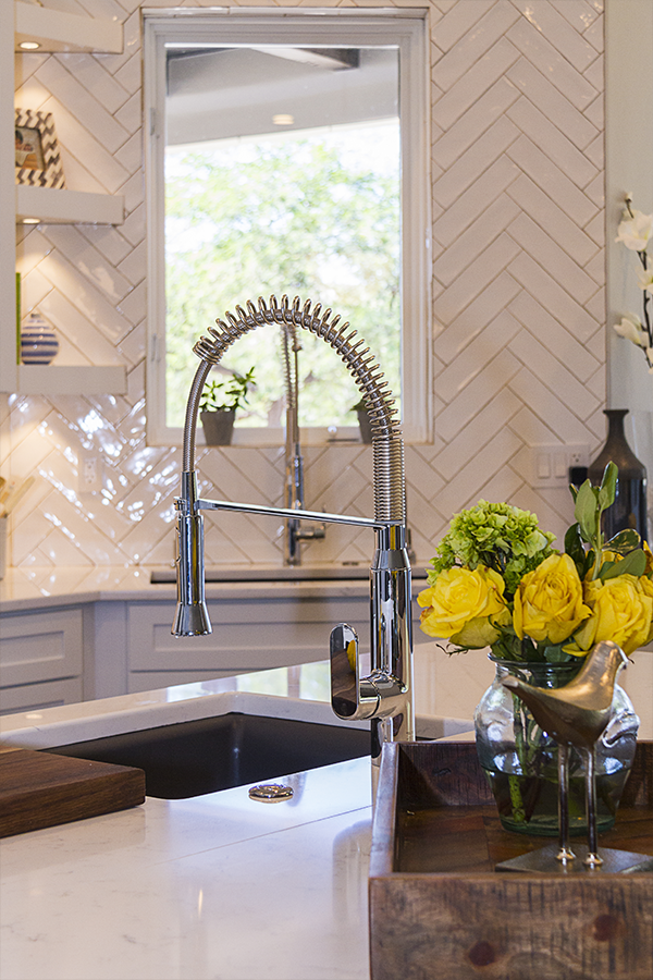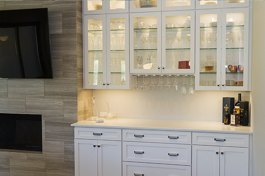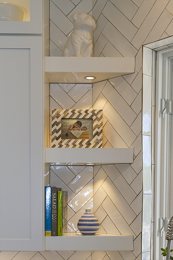 Ultimately, we supersized the island deciding there was plenty of room for furniture layout and the counter fabricator could make a nice seam. Careful consideration was taken planning the storage and placement of pieces including a sink and microwave drawer. Seating for four was incorporated on the far side. We also supersized the height of cabinets along the back wall with stacking cabinets and supersized the appliances with a 48” Wolf Range, 48” Sub Zero and 30” Wine Refrigerator. One thing leads to another, we added a dry bar and entertainment area across the room in matching cabinets. Then we added a laundry room in a fun light grey with encaustic tile floors. The kids bathroom matched the island with some fun tile patterns and finally we did dark moody office in shades of black on the walls, floors, cabinets counters and furniture.