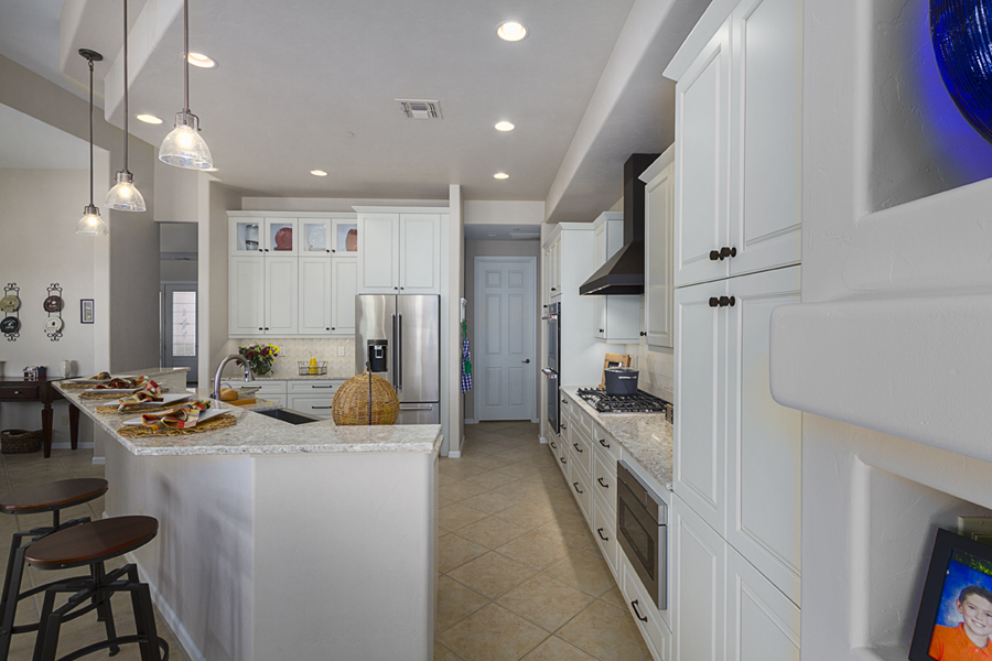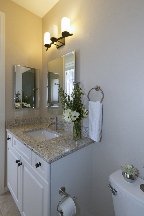 In the kitchen, the details that made the difference were: 1) stacking cabinets higher with glass on one side to add interest 2) adding dark bronze accessories to contrast against the white 3) varying the backsplash design on separate walls and taking it up around the hood area. In the bathroom, the details that made the difference were 1) filling in the floor for a freestanding tub with a natural pebble stone to look intentional 2) accenting with the same bronze in the fixtures and accessories 3) creating feature walls with tile art design.