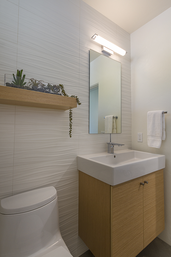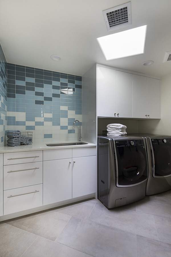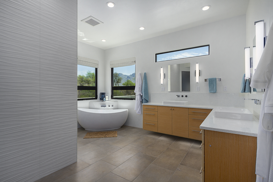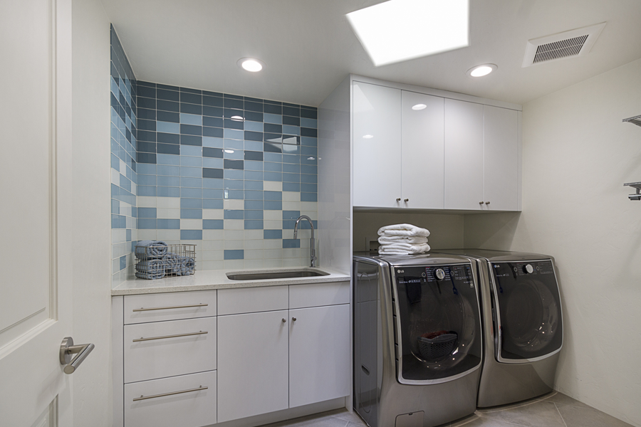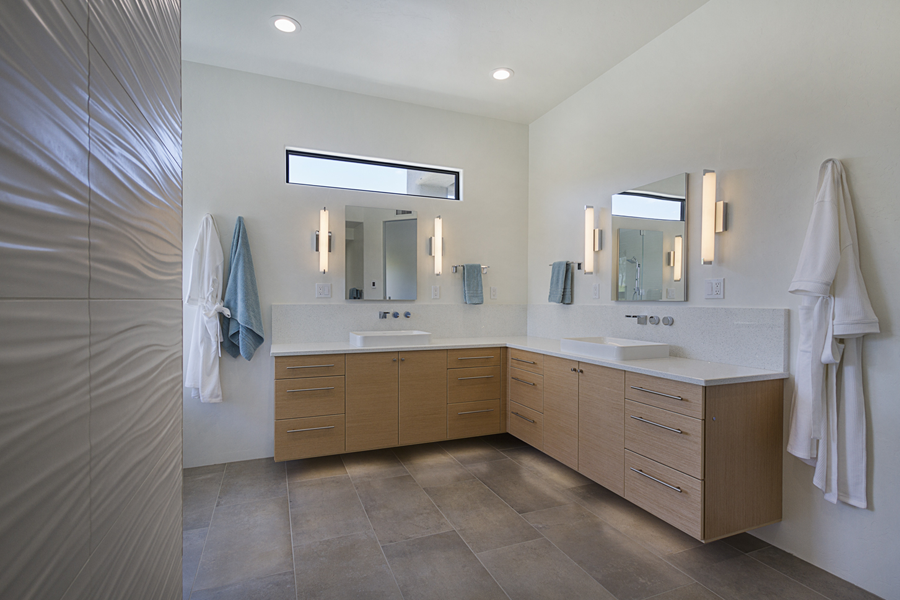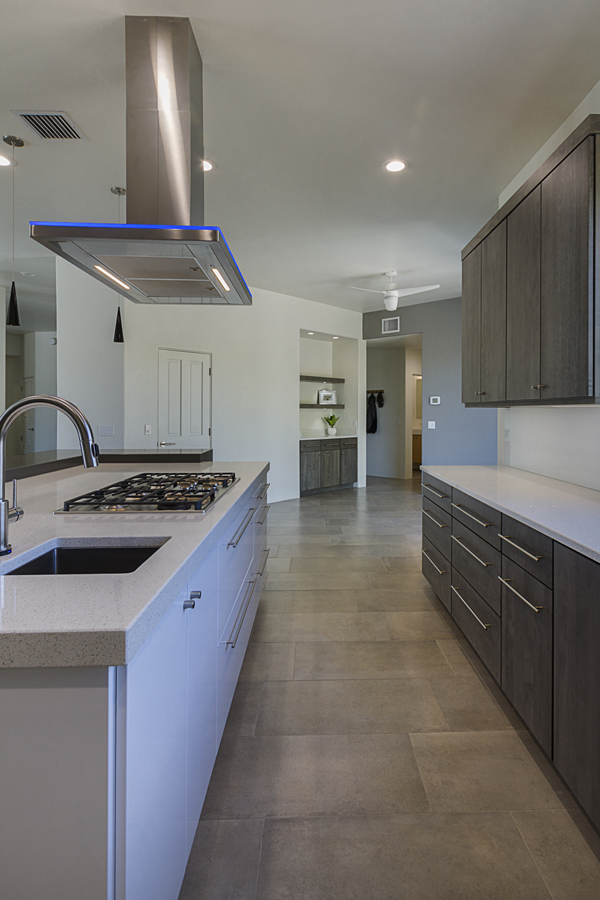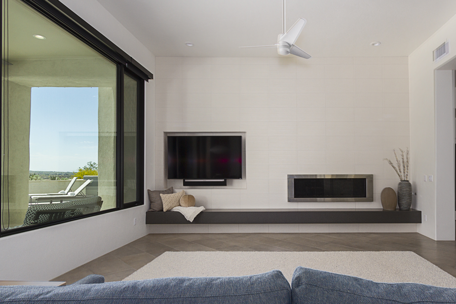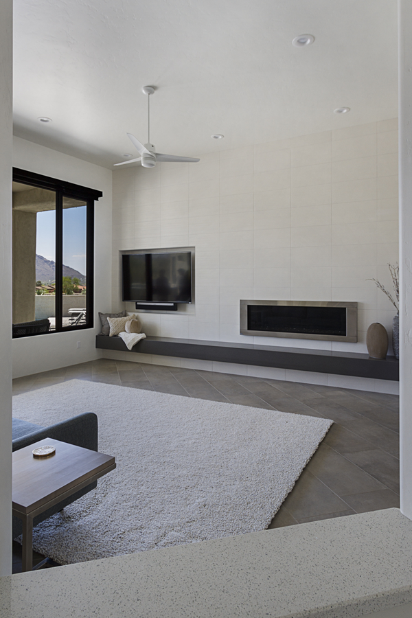 Starting with the great room, the kitchen was transformed with a single multi-functional island. The living room received a facelift, removing walls and arches and adding a monolithic tile wall featuring a floating hearth, a linear fireplace and a recessed television and all new windows and doors. The master suite packed the most changes per square foot, straightening every angled wall possible to make the minimalist conversion. The guest bath, powder bath, laundry, dining room, bedrooms and office received similar treatments to make the entire space cohesive. A very simple floor tile and a basic white paint carried throughout the entire house. Five walls were chosen to bring in some depth with a true gray wall paint. A light wood to warm-up the bathrooms, otherwise all materials followed suit with the white/grey/blue-green theme.