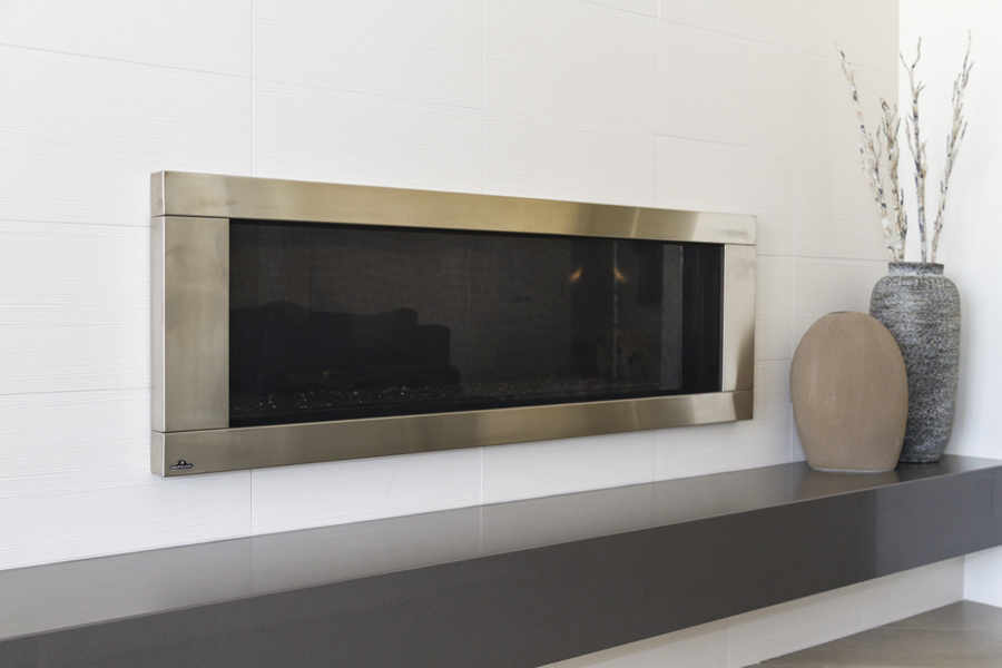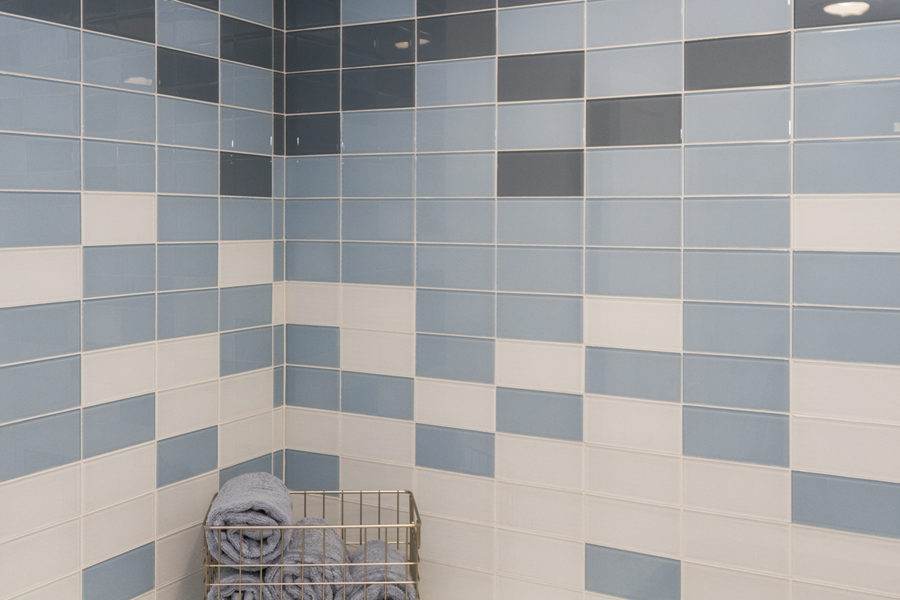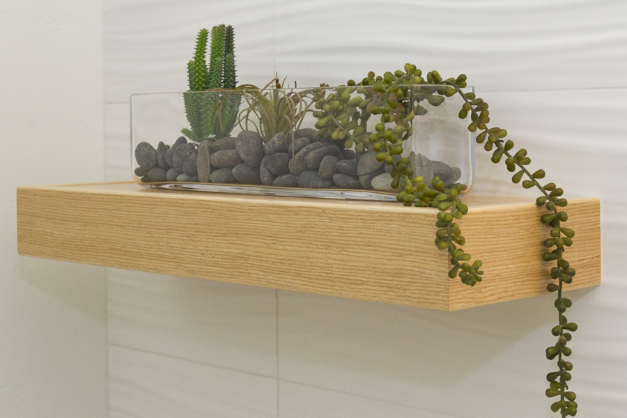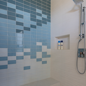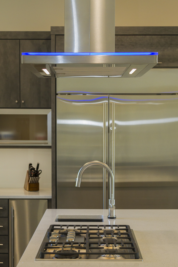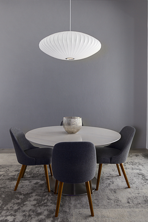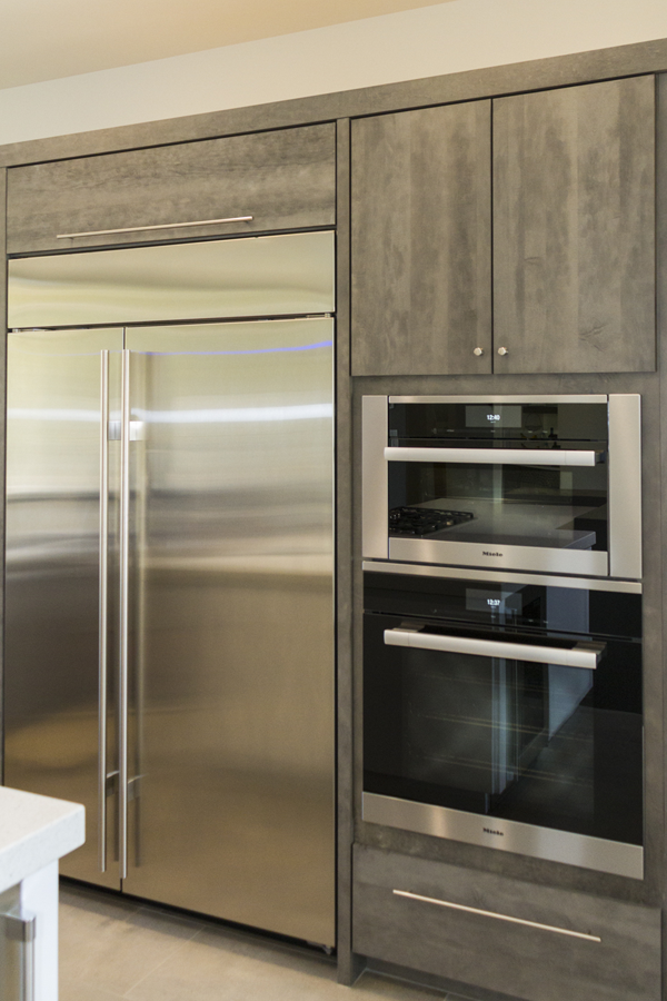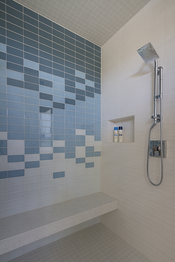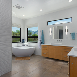 Starting with the great room, the kitchen was transformed with a single multi-functional island. The living room received a facelift, removing walls and arches and adding a monolithic tile wall featuring a floating hearth, a linear fireplace and a recessed television and all new windows and doors. The master suite packed the most changes per square foot, straightening every angled wall possible to make the minimalist conversion. The guest bath, powder bath, laundry, dining room, bedrooms and office received similar treatments to make the entire space cohesive. A very simple floor tile and a basic white paint carried throughout the entire house. Five walls were chosen to bring in some depth with a true gray wall paint. A light wood to warm-up the bathrooms, otherwise all materials followed suit with the white/grey/blue-green theme.