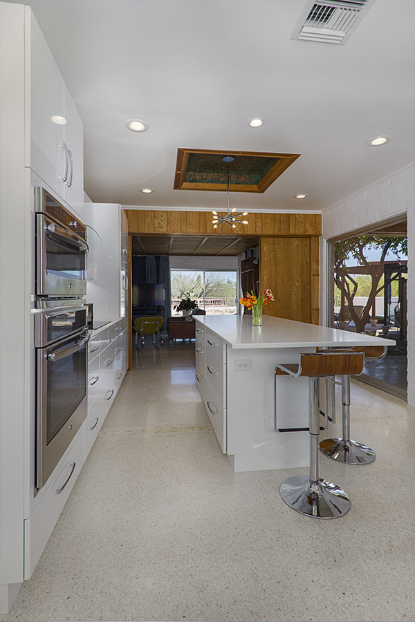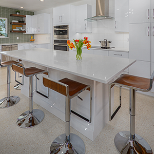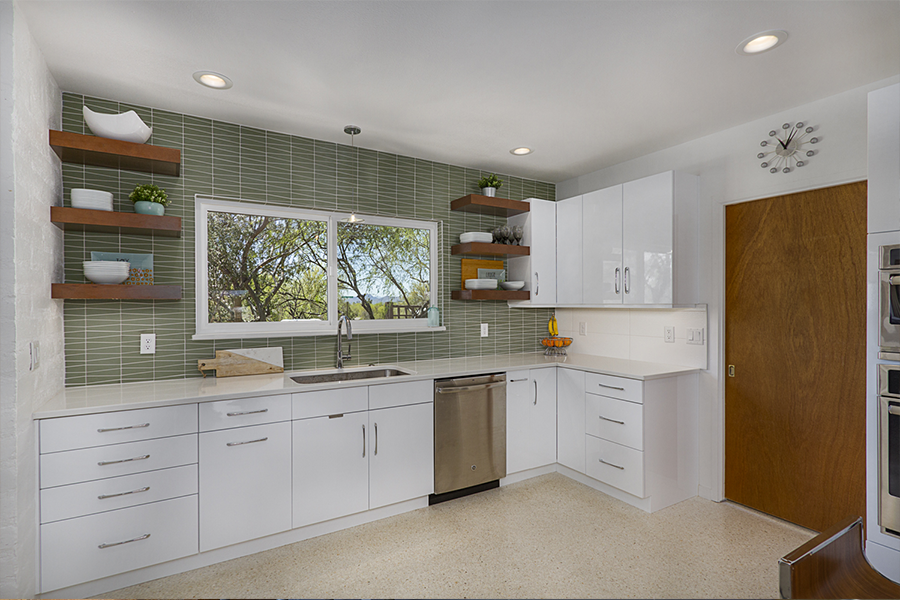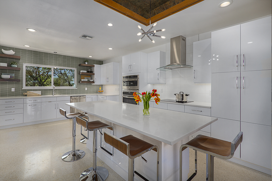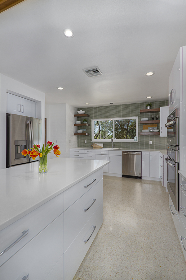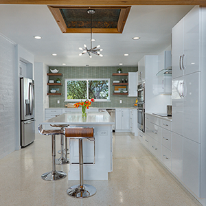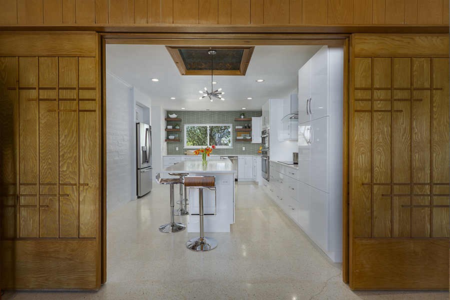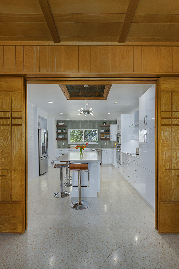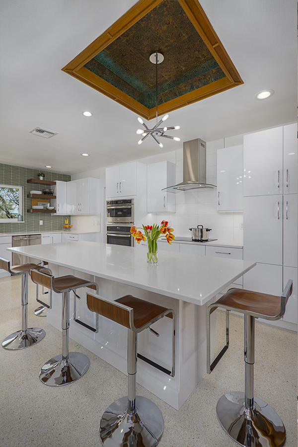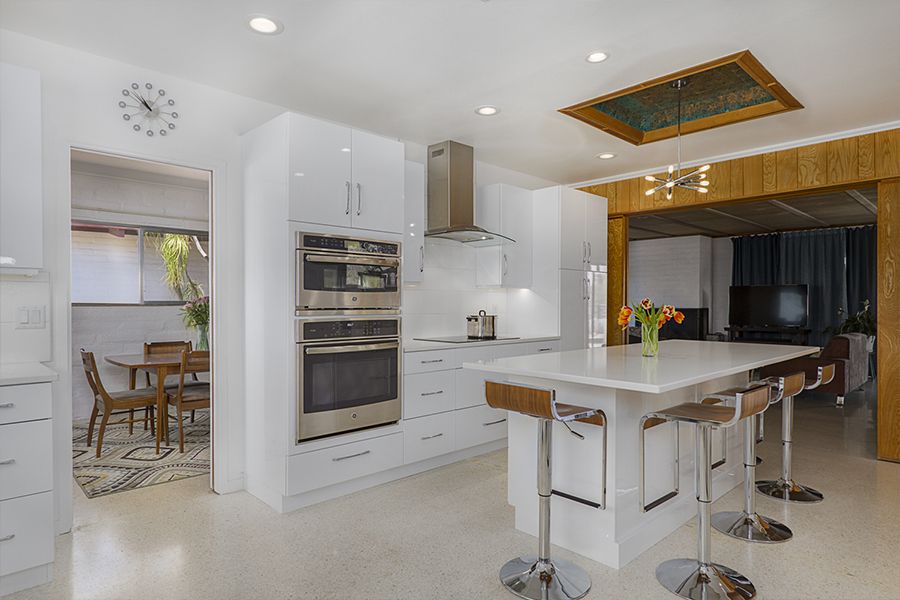The trick was removing a wall and patching in terrazzo, a new location for all the kitchen appliances and incorporating the unique ceiling coffer and maintaining the sliding doors. Flat panel, high-gloss, white cabinets with white terrazzo floors and white quartz counters are all low maintenance but could be seen as austere. Creating a tile feature wall, adding floating wood shelves, and layers of light balanced this with the addition of a few classic accessories in the bar stools and Nelson clock.