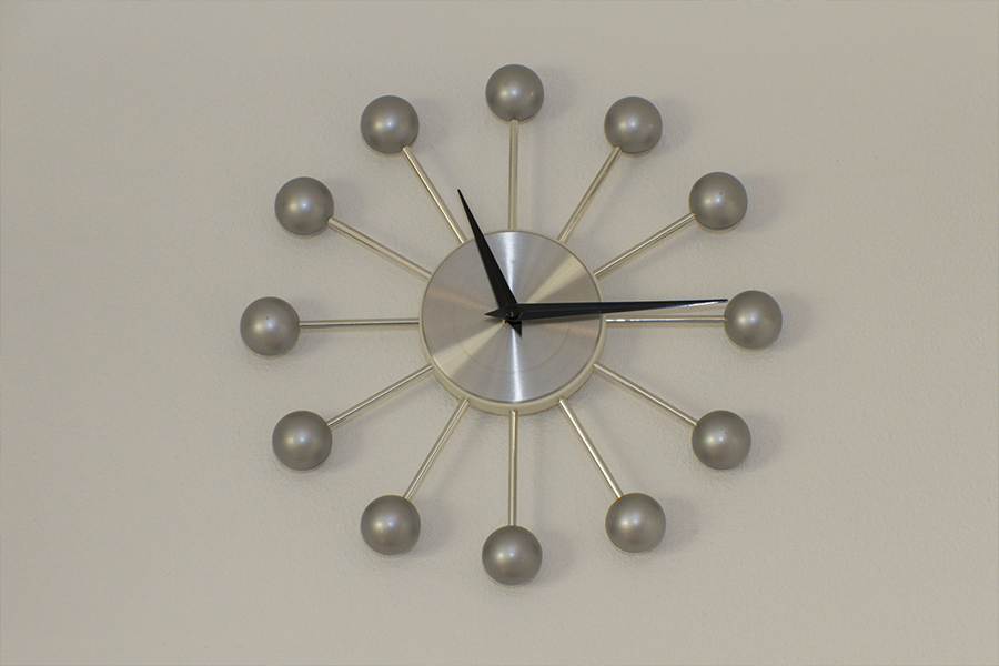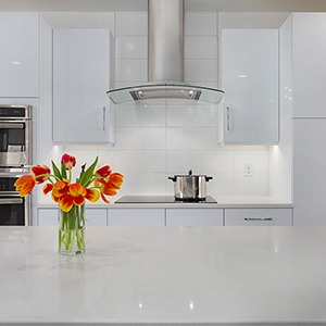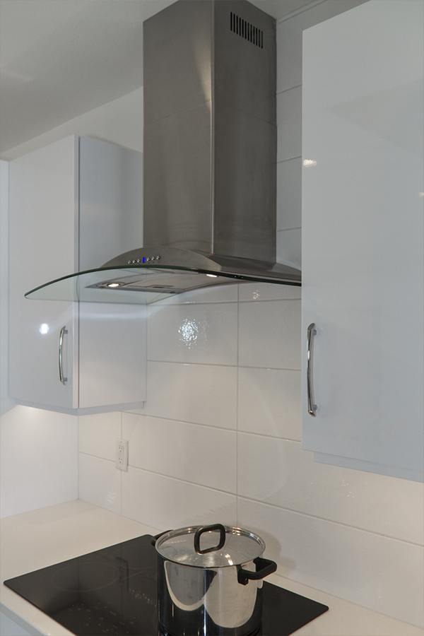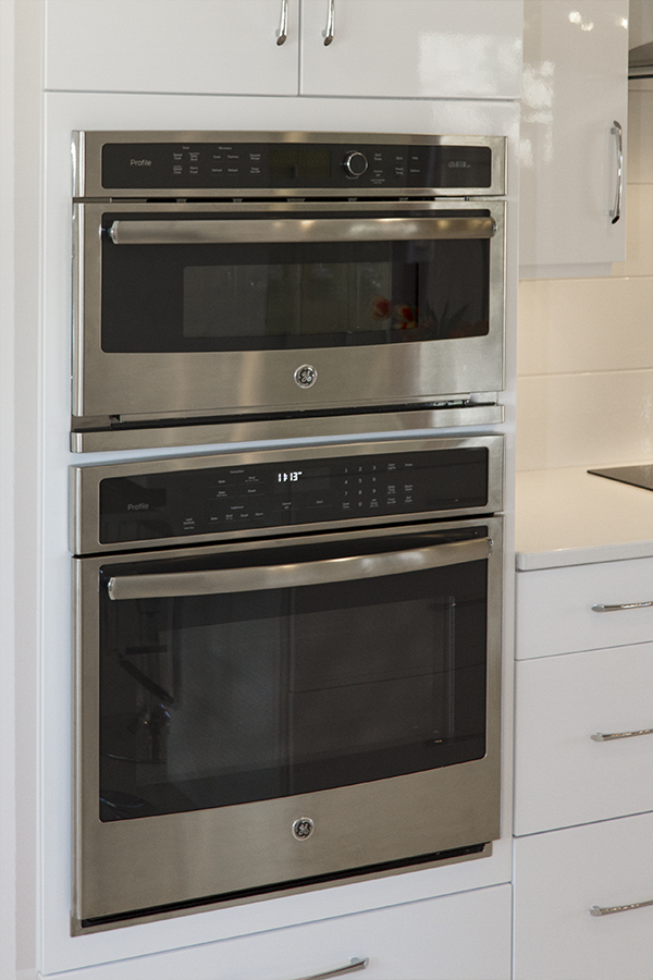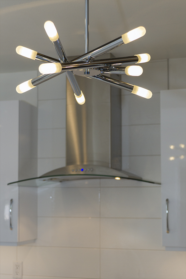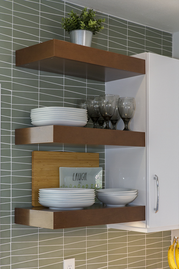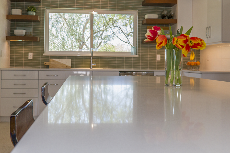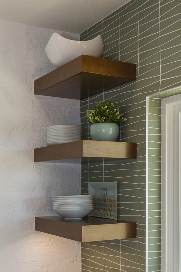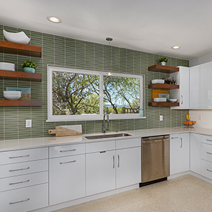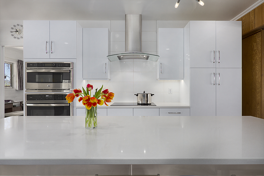 The trick was removing a wall and patching in terrazzo, a new location for all the kitchen appliances and incorporating the unique ceiling coffer and maintaining the sliding doors. Flat panel, high-gloss, white cabinets with white terrazzo floors and white quartz counters are all low maintenance but could be seen as austere. Creating a tile feature wall, adding floating wood shelves, and layers of light balanced this with the addition of a few classic accessories in the bar stools and Nelson clock.